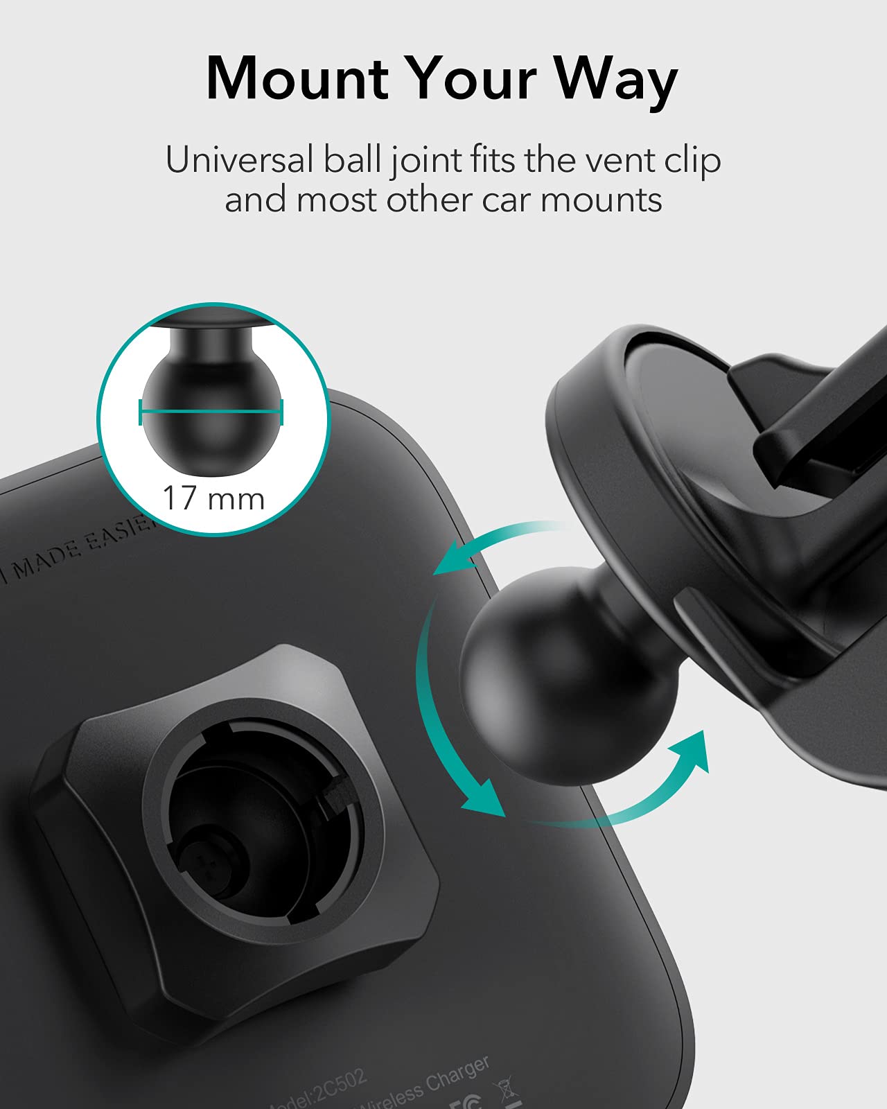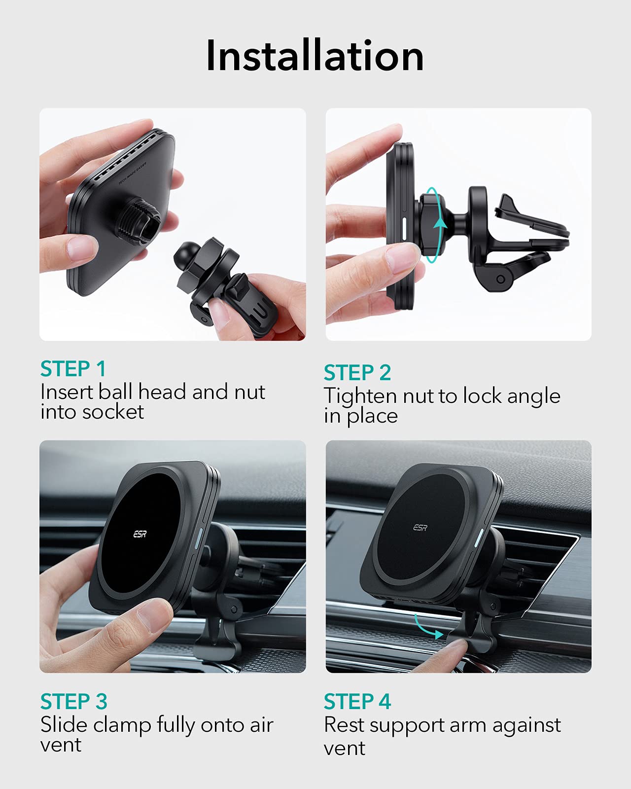 • Includes a HaloLock Magnetic Wireless Car Charger, air vent clamp, 3.3 ft (1 m) USB-A to USB-C cable, and manual; car charging adapter not included