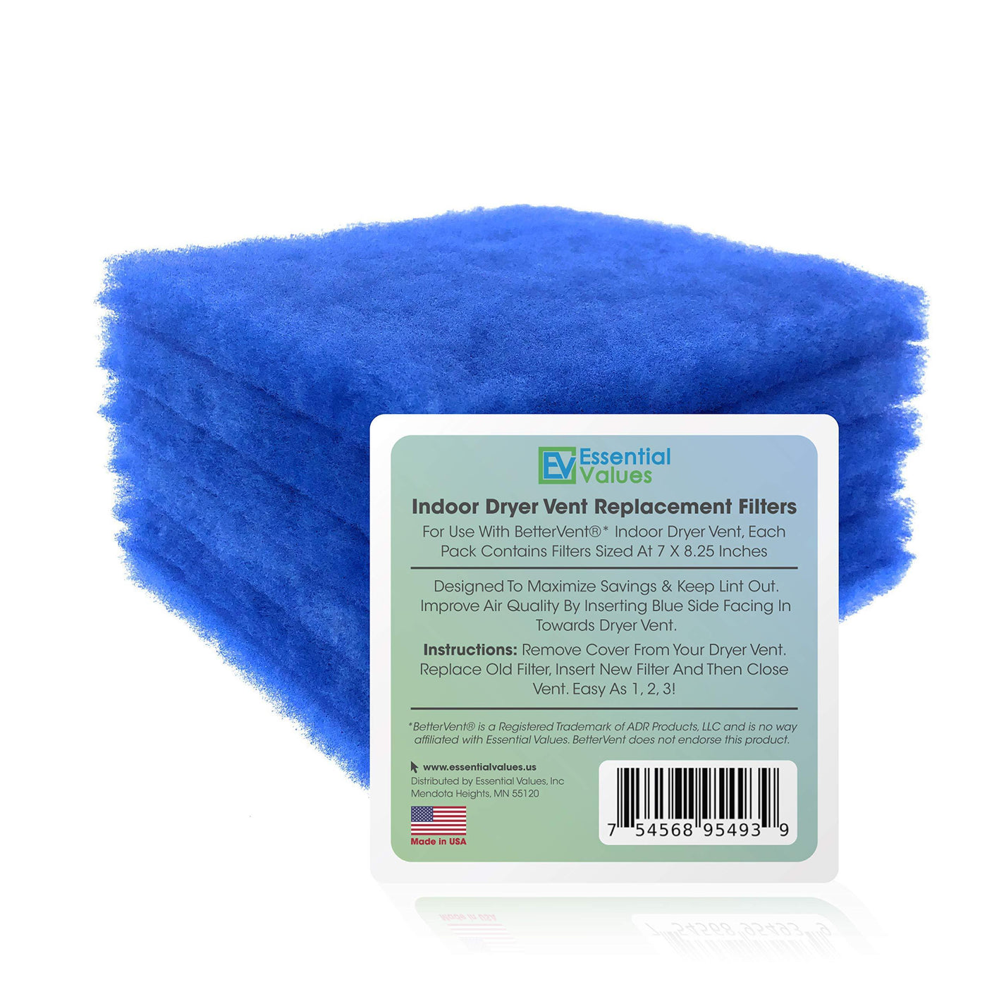 Read more Essential Values Indoor Vent Replacement Filter Maintain the lint build up in indoor dryer vent effectively by using our carefully engineered replace filters. Keeps air quality of your home clean, and do not let those nasty bacteria and unwanted dust particles to come uninvited. Our state of the art design traps even the finest of lint and only lets fresh air in. Essential Values is committed to providing quality products to its customers for a stress-free experience. To us quality is everything, which is why we take into consideration your feedback and engineer our products to perfection! A proud ‘Made in USA’ company that strives for a better clean future everybody. Aftermarket Replacement Compatible with BetterVent Indoor Dryer Vent Designed to maximize savings and to keep out lint. Our polyester replacement filter measures 7 x 8.5 inches. Get a pack of 6, 12, 18, or 24 as per your requirement. Each filter protects up to 5 dryer loads! For best results insert blue side facing towards dryer vent. Read more Remove the cover from the dryer went, remove the old filter, insert new Essential Values filter and then close. Instead of vents getting all clogged up and hindering the air flow, use our filter which traps all the dust particles for clean airflow. Essential Values always delivers quality products and has made a name for itself on the market. Read more