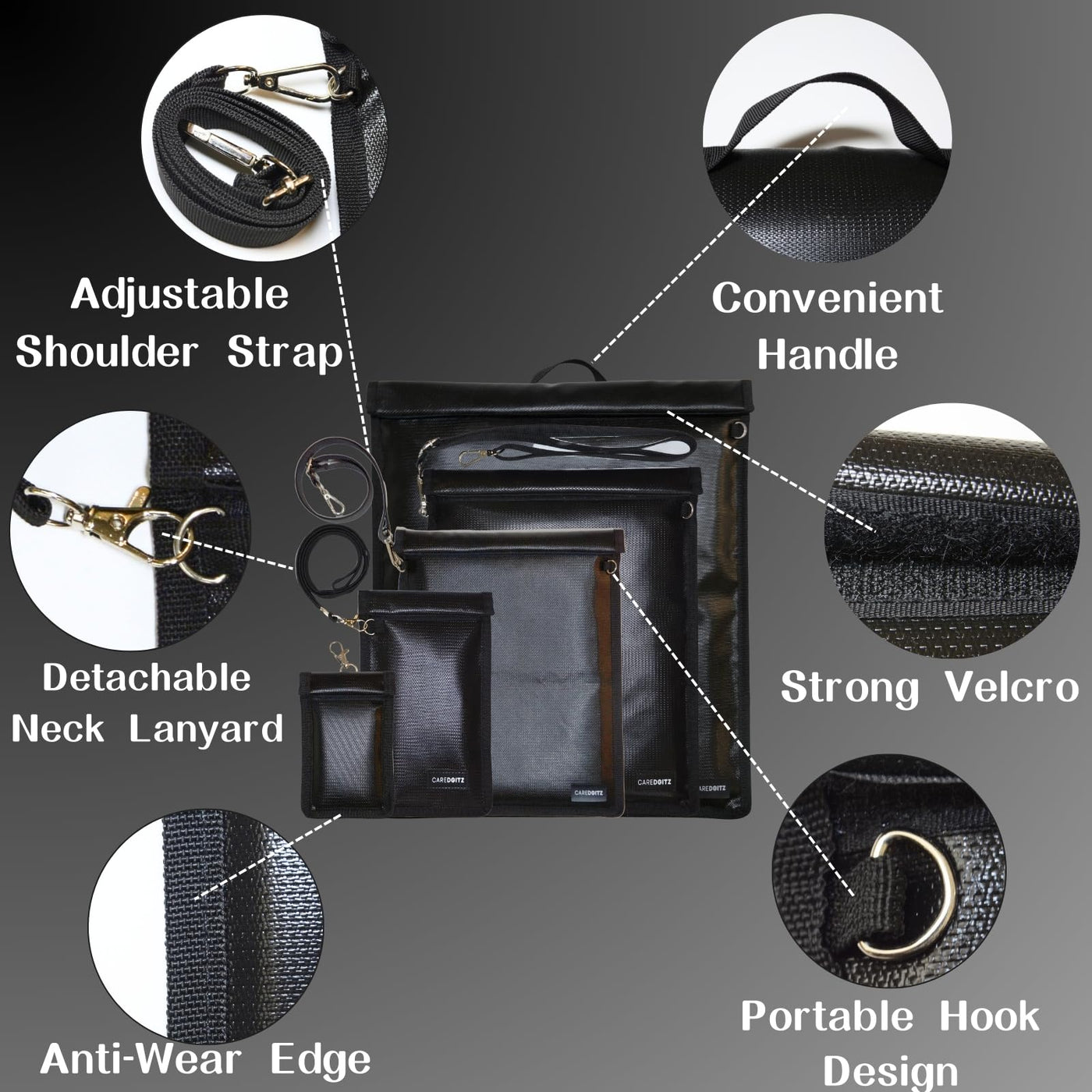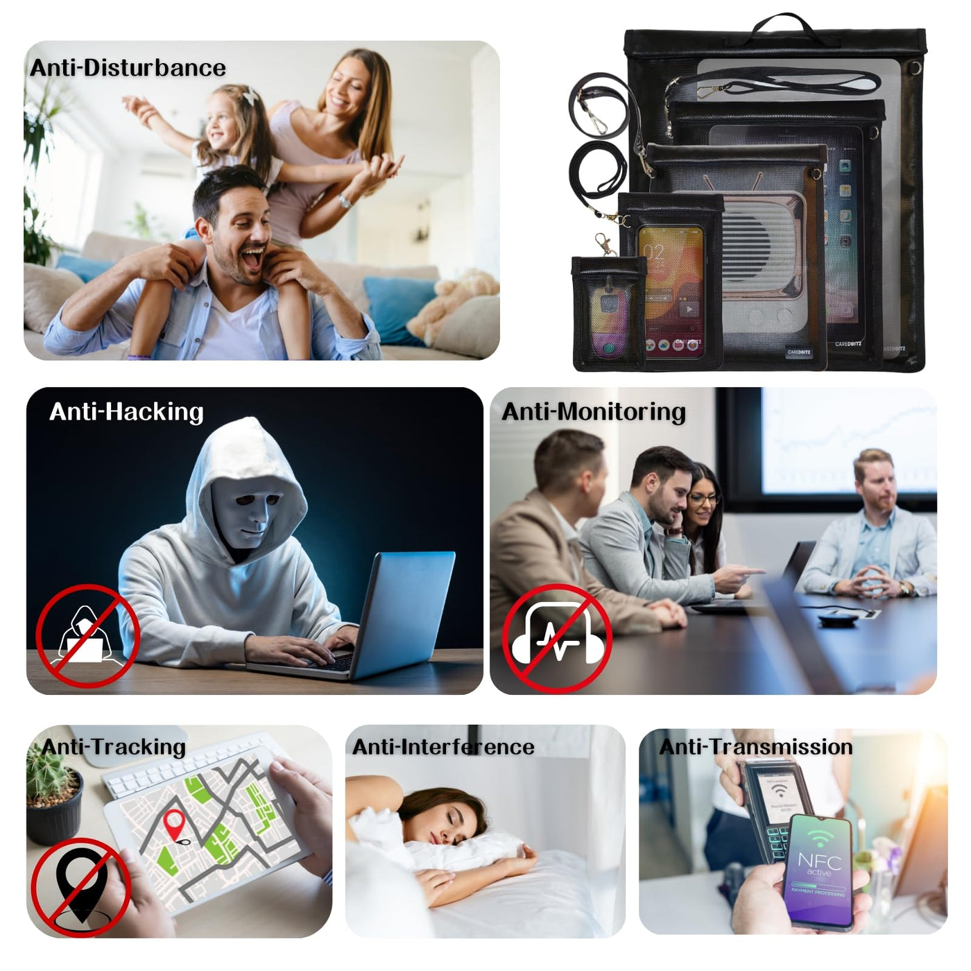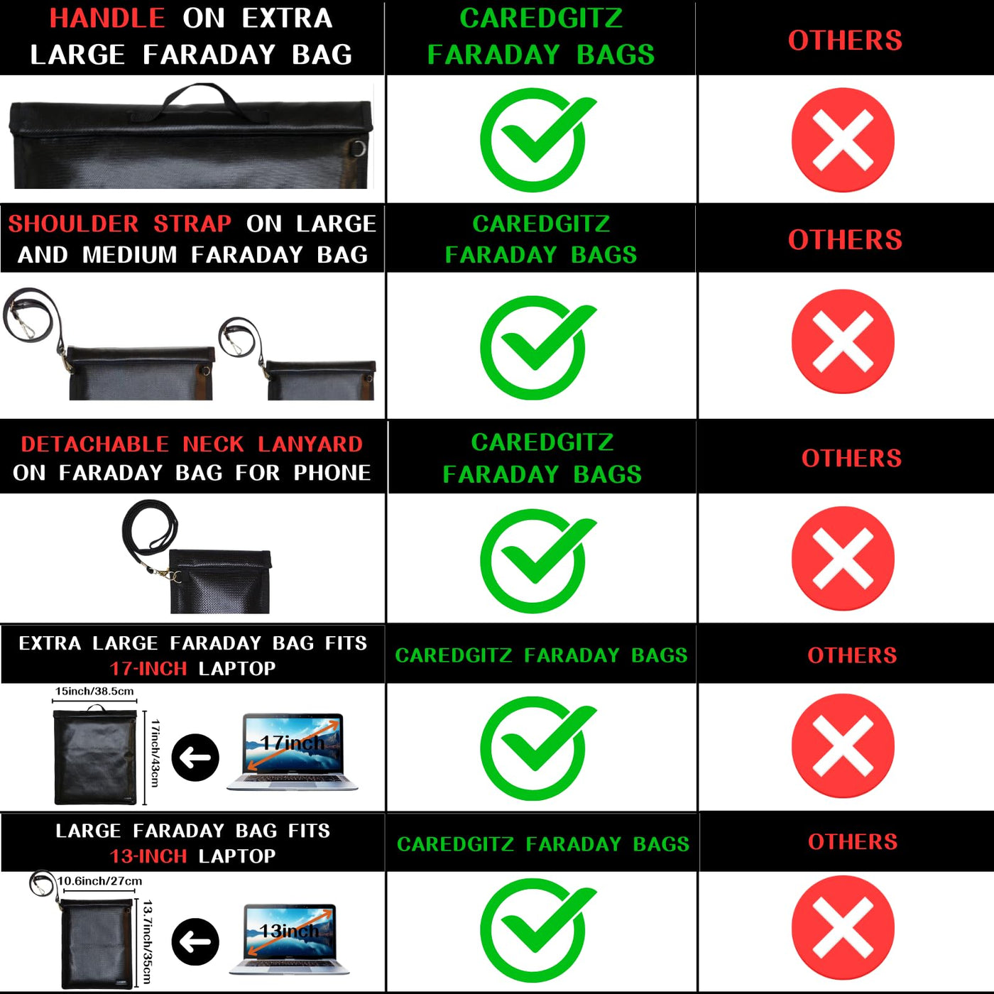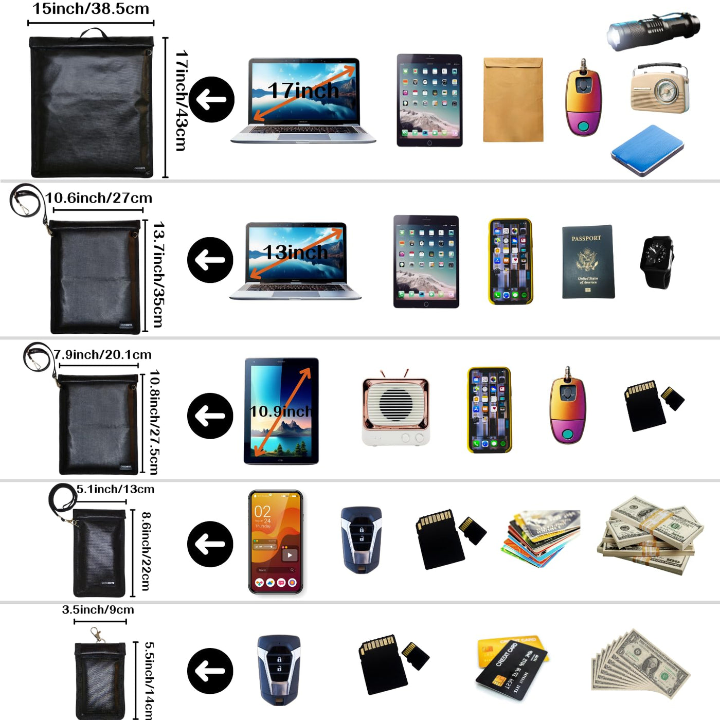 - 5 PACK FARADAY KIT - The extra large faraday bag with handle(17" x 15"), fits laptops, tablets, phones, GPS units. Large faraday cage with shoulder strap(13.7" x 10.6"), fits laptop(up to 13"), tablets, phones. Medium Faraday pouch with strap(10.83"7.9"), fits tablets(ipad air, ipad mini), radios(excluding two way radios and walkie talkie), phones. Faraday phone sleeve with lanyard(8.6" x 5.1"), fits phones, cards, cash. Key fob protector(5.5" x 3.5"), holds car keys, door opener, cards, cash.