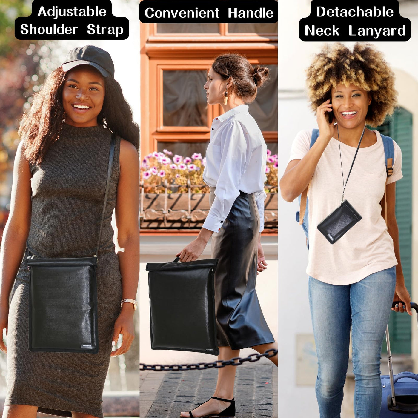 - PORTABLE FARADAY POUCHES - Uncover convenience with our laptop Faraday bags, boasting a seamlessly integrated handle. Elevate security and style with our tablet Faraday cages, featuring an adjustable shoulder strap for versatile carrying including crossbody, shoulder, or hand carry. Stay connected with our cell phone Faraday emp bag with a practical neck lanyard. Experience ease with our Faraday key fob blocker, equipped with a robust metal belt clip for secure attachment and quick access.