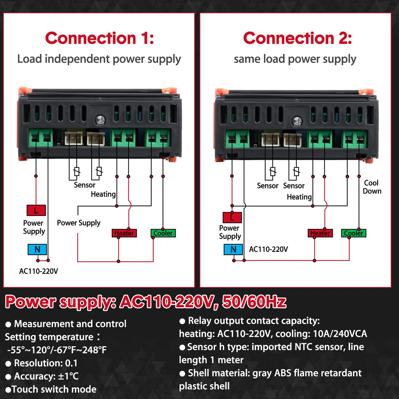 - Effective and protective design: Heating: 10A/ 240VAC, Cooling: 10A/ 240VCA, accurate and reliable, stable and safe; Cooling control, output protection of delay; Digital Temperature Controller alarms when the temperature exceeds the temperature limit value or when a sensor error occurs