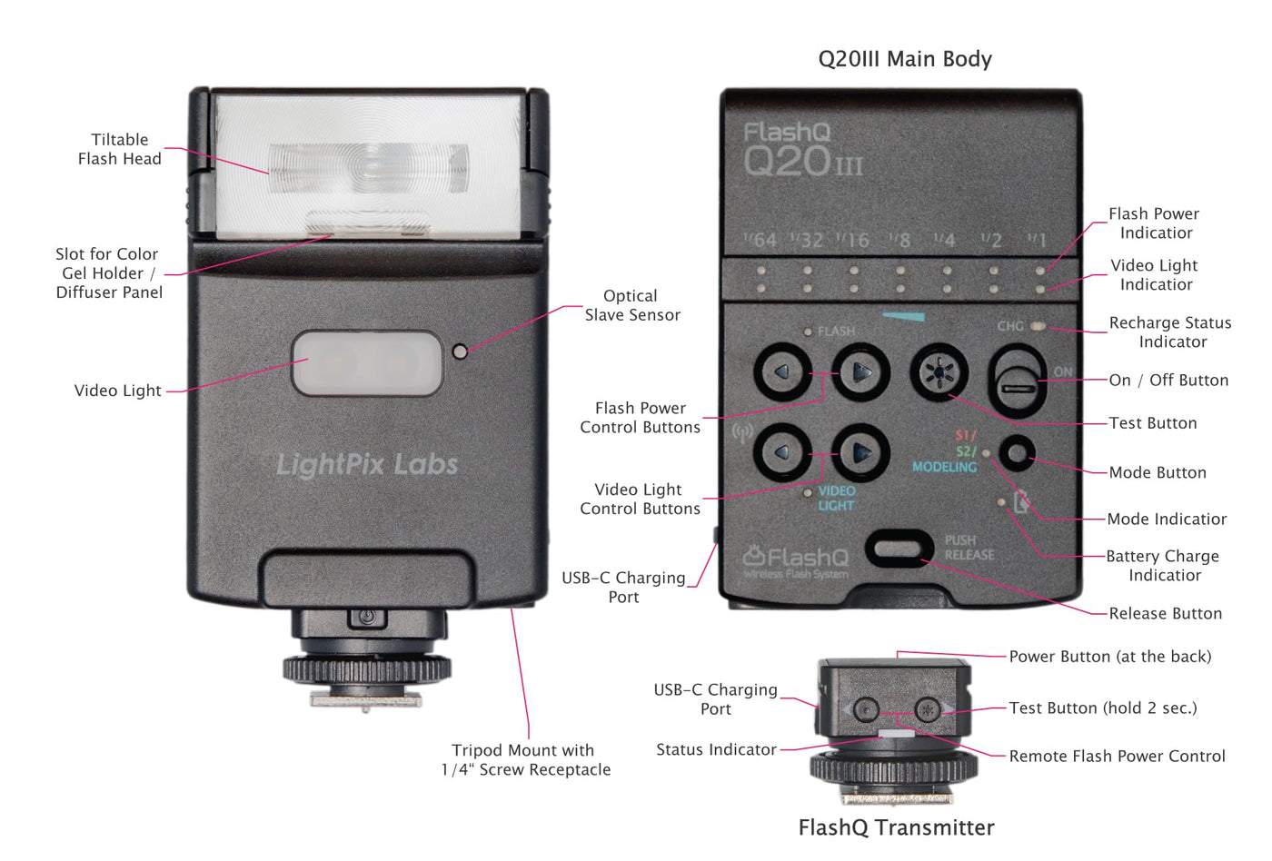 A complete wireless handy flash unit, FlashQ Q20III, is a full featured GN20 flash with detachable radio transmitter, LED lighting, flash head tilting, color gel pack and diffuser panel. It is convenience to charge Q20III with standard USB Type-C power sources. Just make certain to use rechargeable Ni-MH batteries on Q20III flash body. Technical Specifications: Guide Number 66ft (at ISO 100) Focal length coverage: 32mm (Full-Frame) Manual flash power ratio control (7 steps adjustable, 1/64 to 1/1) LED video light (7 steps adjustable, Max. 60 lux output at 1m) 2.4GHz low-power digital radio (FlashQ Receiver) inside Q20III main body 32ft wireless operating range Tilt-capable flash head, up to 90° and with click-stops at 0°, 45°, 60°, 75°, 90° Other functions: S1 / S2 optical slave, modeling light (LED) Transmitter per charge : 80 hours operation and 120 days standby Two AA-size alkaline / rechargable Ni-MH batteries for Q20III main body Recycling time (1/1 full power output) : 7 sec. by fresh alkaline batteries / 6 sec. by Ni-MH batteries Number of flashes : 100 - 2000 flashes by fresh alkaline batteries LED lighting time: approx. 1 hour (at full power LED output and by Ni-MH batteries) Flash color temperature : 5600K±200K (same as daylight) LED color temperature : 5500K±300K , CRI 95 Dedicated socket for FlashQ transmitter attachment Dimensions : 2.3(W) x 4.0(H) x 1.1(D) inches (with FlashQ Transmitter attached) Weight : 4oz (without battery) Package Contents: 1 x FlashQ Q20III main body (Battery is not included) 1 x FlashQ Transmitter (with built-in rechargeable lithium battery) 1 x Diffuser panel (-1.3 EV) 1 x Color gel holder 1 x Color gel pack (7 colors) 1 x Protective pouch 1 x USB charging cable 1 x User manual FlashQ Q20III main body requires two AA batteries (not included). Highly recommended to use the rechargeable Ni-MH AA batteries on FlashQ Q20III for quick recycling time and convenience of USB charging capability.