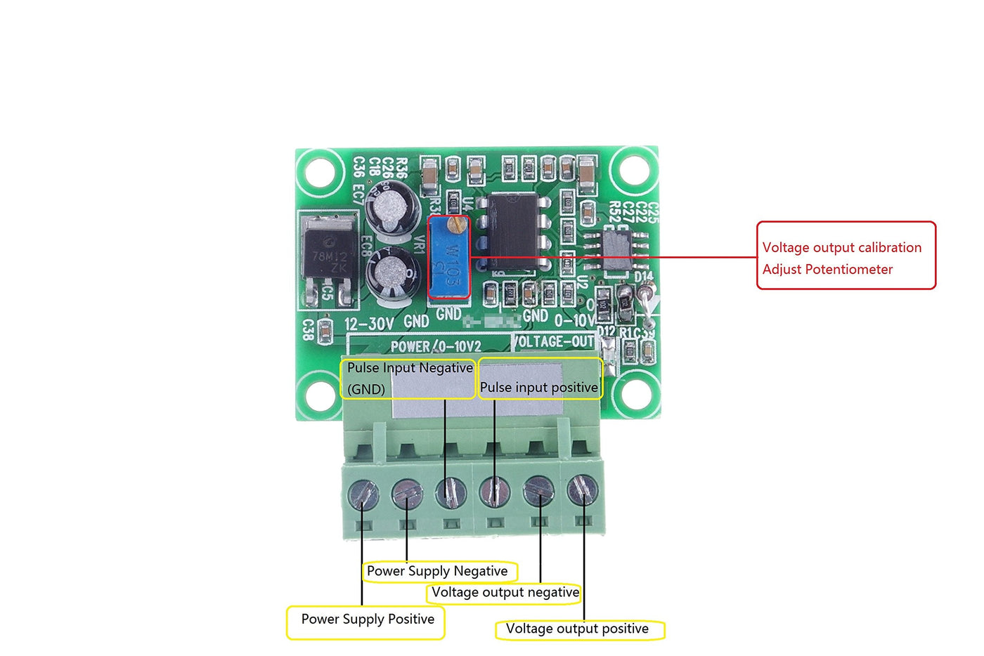 0Hz to 3KHz frequency pulse signal into 0-5V analog voltage signal. Can be used for PLC and inverter interface between the conversion, or motion control card and inverter interface matching control occasions. Input pulse level is 5V / 12V / 24V can be directly input, no need to string resistance. But the input signal frequency, to maintain more than 0.5 seconds. The output current is 5mA. The input power supply voltage range is DC12-30V. Instructions for use: 1, Multi-turn potentiometer is used to calibrate the frequency and voltage of the corresponding relationship. 2, The input power supply voltage range of DC12-30V. 4, For the use of PLC, support NPN type. Must have ground wire. 5, If used with the encoder, the encoder constant speed required to continue to rotate more than 0.5 seconds. 6, F / V conversion module, the response time of about 0.3-0.5 seconds Note: 1. Accuracy is 1%, can not be accurate to the decimal point after the two digits, if the use of high precision requirements are not recommended. 2. You can adjust the blue potentiometer on the board to calibrate (in the factory, we have F / v potentiometer to adjust a certain correspondence, generally do not recommend self adjustment). 3. If the signal input is turbine flow, due to signal matching reasons, to add a 817 optical coupler and a resistor in order to make the flow meter to function properly. Package Included: 1Frequency To Voltage Conversion Module