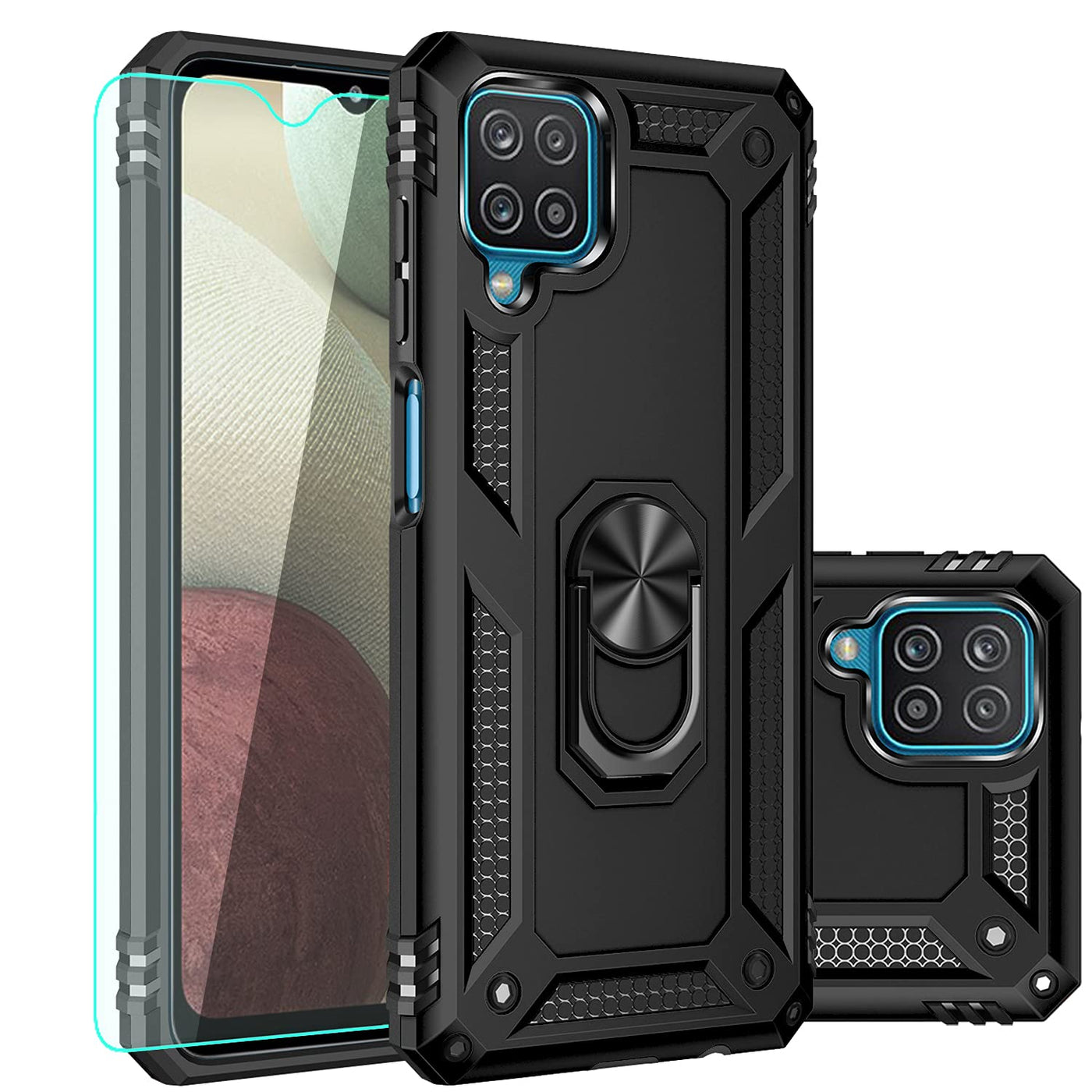 Frequently asked questions (FAQ) Question 1: Does it compatible with Galaxy 12? Answer: Yes, it perfectly fits Galaxy A12. Question 2:Is the case edge higher than the phone screen? Answer: it is a little bit higher, One millimeters or so. Question 3: Does this come with a HD screen protectors? Answer: Yes, every case package come with 1 pieces PET HD Screen Protector (Plastic). Question 4: Will the case support wireless charging? Answer: No, the case does not allow for wireless charging. Please remove it before placing it on a wireless charger. Question 5: Does the kickstand stick to the magnetic car mount holder? Answer: Yes, it is a built-in metal magnetic sheet for stable adsorption, which can be directly adsorbed to the magnetic car mount holder. Question 6: Is there an sale service? Answer: Replacement or refund for any quality issues that arise during the 90 days. Welcome to contact our sale service at any time. Product Features: High-quality Materials: Made of premium shock-absorbing materials, consists of soft TPU and hard PC. Two-In-One case cover design provide superior protection. And avoiding anti-collision, shockproof, scratch-resistance, non-slip, impact protection, the maximum protection of your mobile phone life Raised Edges: Raised lip protects your screen and camera from surface scratches Precise hole position: Accurate tailoring makes it easy to access all sockets and features With ring style kickstand: 360 degree rotating ring moves in a full circle, kickstand lets you watch movies and videos hands-free Magnetic Car Mount: With built-in metal magnetic sheet for stable adsorption, which can be directly adsorbed to the magnetic car mount holder. (Not includes the magnetic car mount holder) Compatible List: Samsung Galaxy A12 Packaging including One Samsung Galaxy A12 Military Grade Kickstand Case with HD Screen Protector