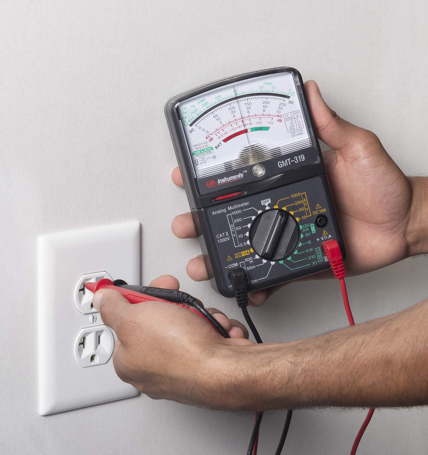 Capable of measuring 7 functions with 19 ranges on an easy-to-read color-coded analog display this multifunctional analog multimeter was engineered to handle electrical tests for the homeowner, hobbyist and professional alike. Unit tests DC Voltage, AC Voltage, DC Current or Amps on a separate jack (fused), Resistance, or Megohm Max and features both visual and audible continuity with buzzer sounds at less than 100 Ohms, Decibels on AC voltage ranges, and common household batteries 1.5V and 9V. Unit includes built-in Zero Ohms adjustment dial allowing you to reset prior to resistance testing and to perform internal battery test function. Incorporates fuse overload protection circuitry to protect the user and a mirror scale is provided to reduce the possibility of parallax errors. Testing household batteries for charge level, troubleshooting various low voltage circuits, testing wall receptacles for proper voltage and grounding, and troubleshooting electrical cords, strings of lights, fuses, and switches to determine if they are operating properly or if a break in the circuit exists and the item in question needs to be repaired or replaced. The decibel feature of this multimeter is used for transistor gain measurement in electronic circuits and should not be confused with audio decibels. From the Manufacturer Professional multi-meter tester.