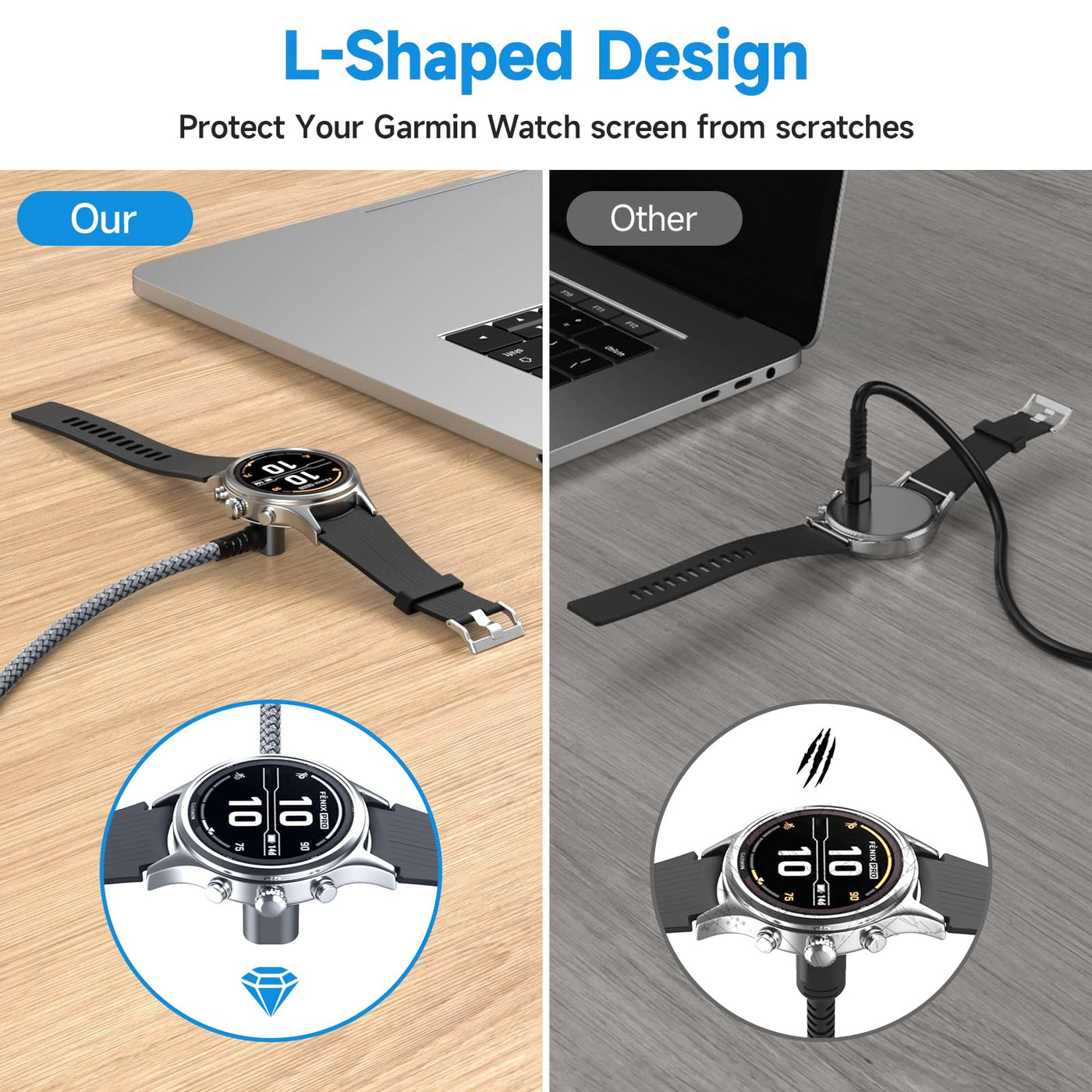 - [ Upgraded Lay-flat Charging Cable for Garmin] Our upgraded charging cable for Garmin smartwatch adopts a L-shaped charging head design, which makes the horizontal charging of the watch more stable and convenient, while better protecting the watch screen.