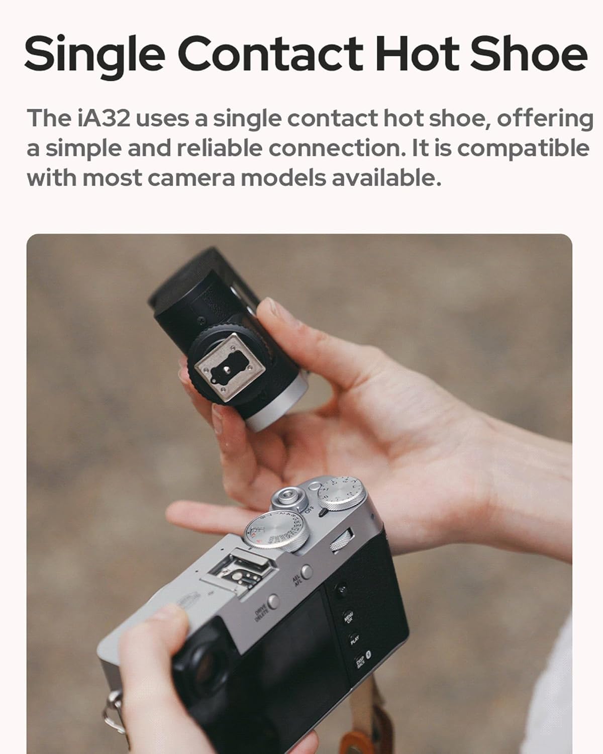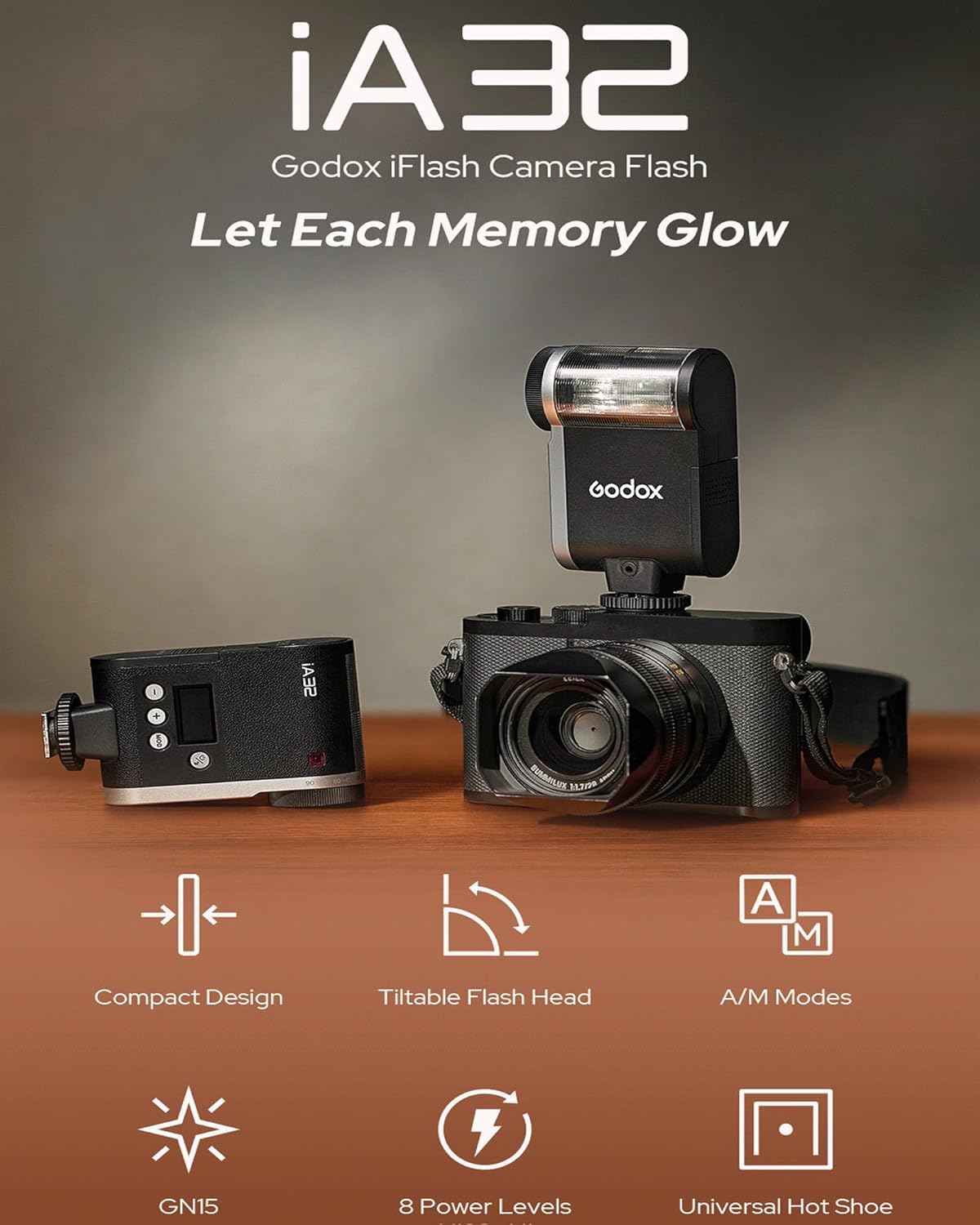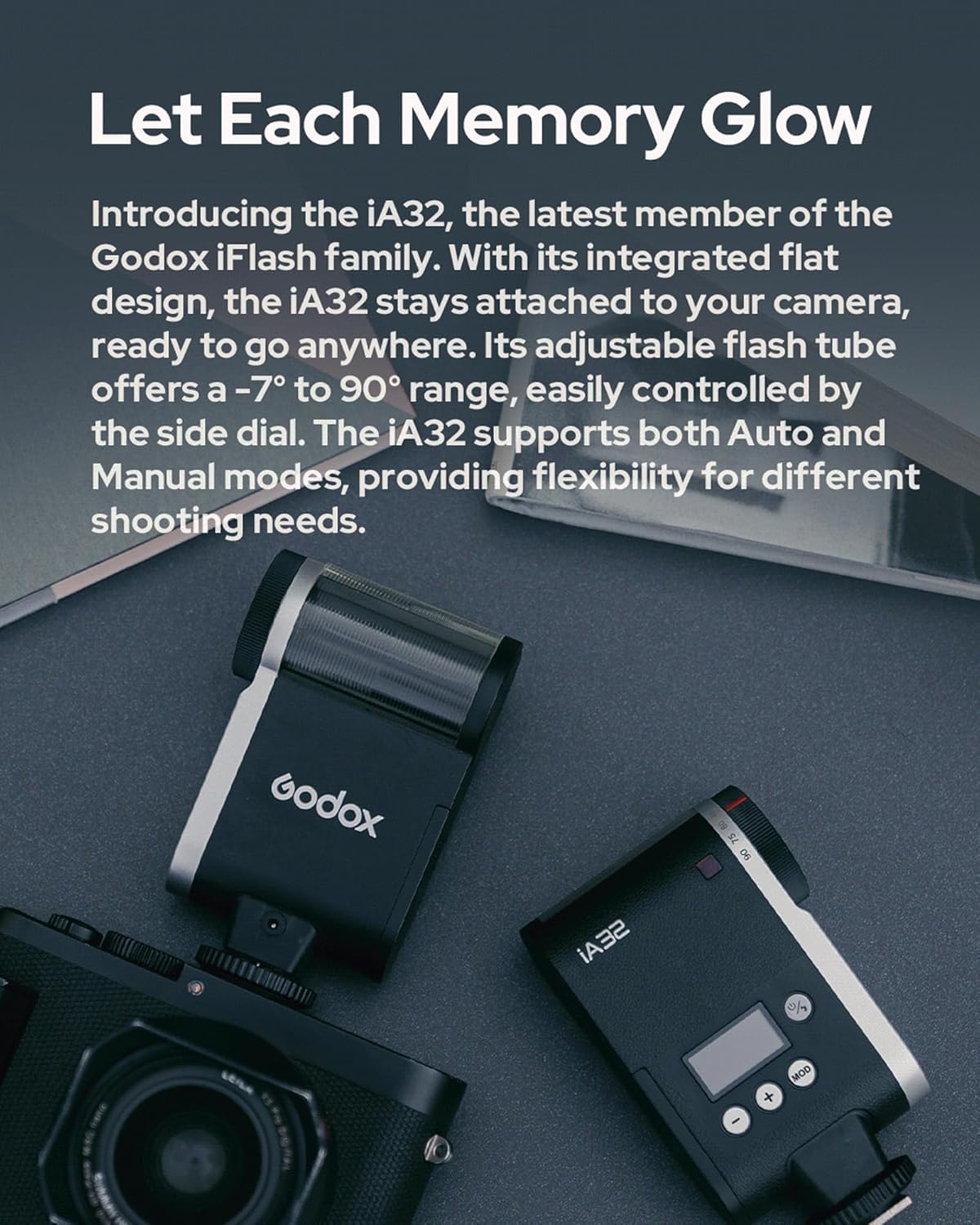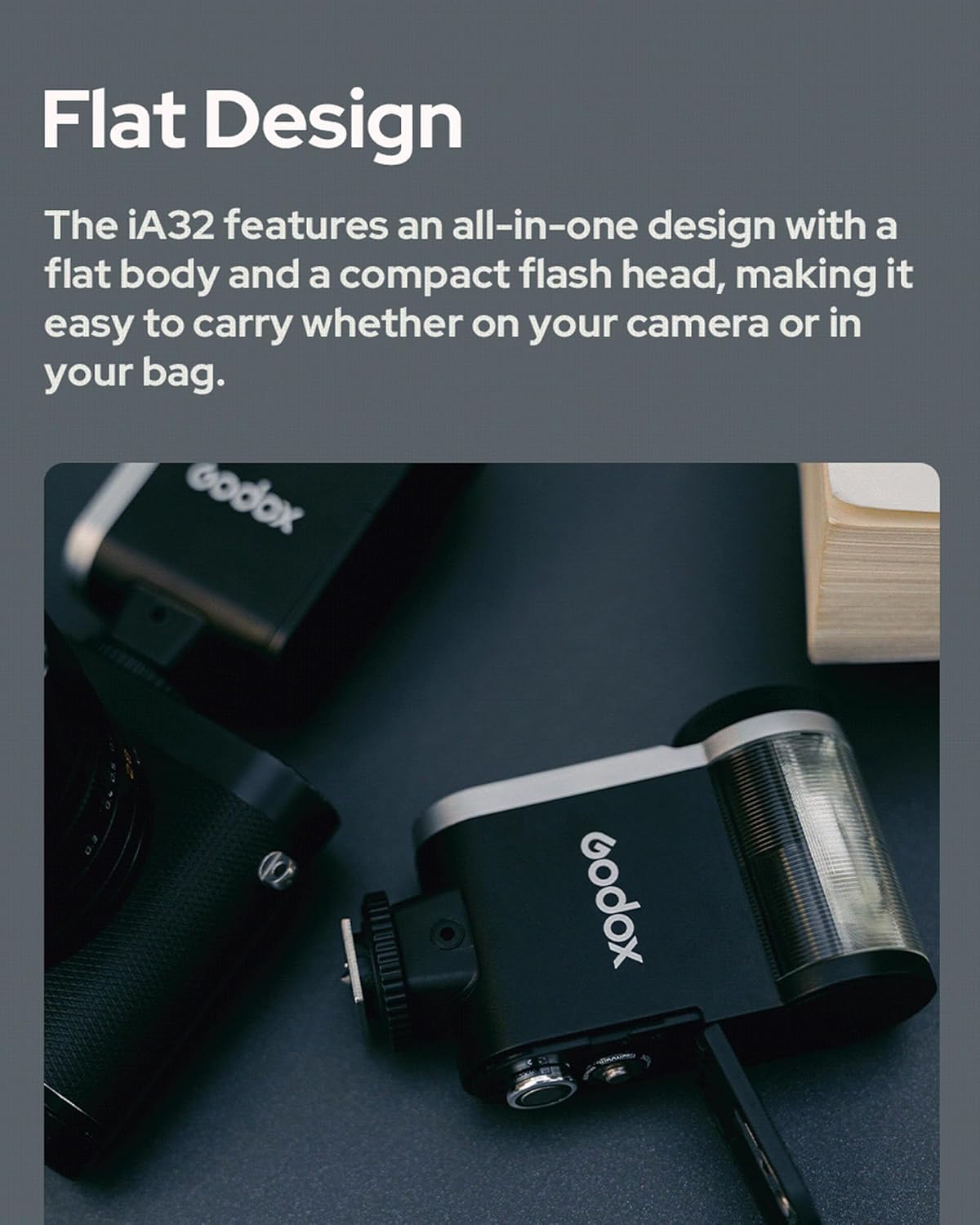 - Flat Design: The iA32 features an all-in-one design with a flat body and a compact flash head, making it easy to carry whether on your camera or in your bag.