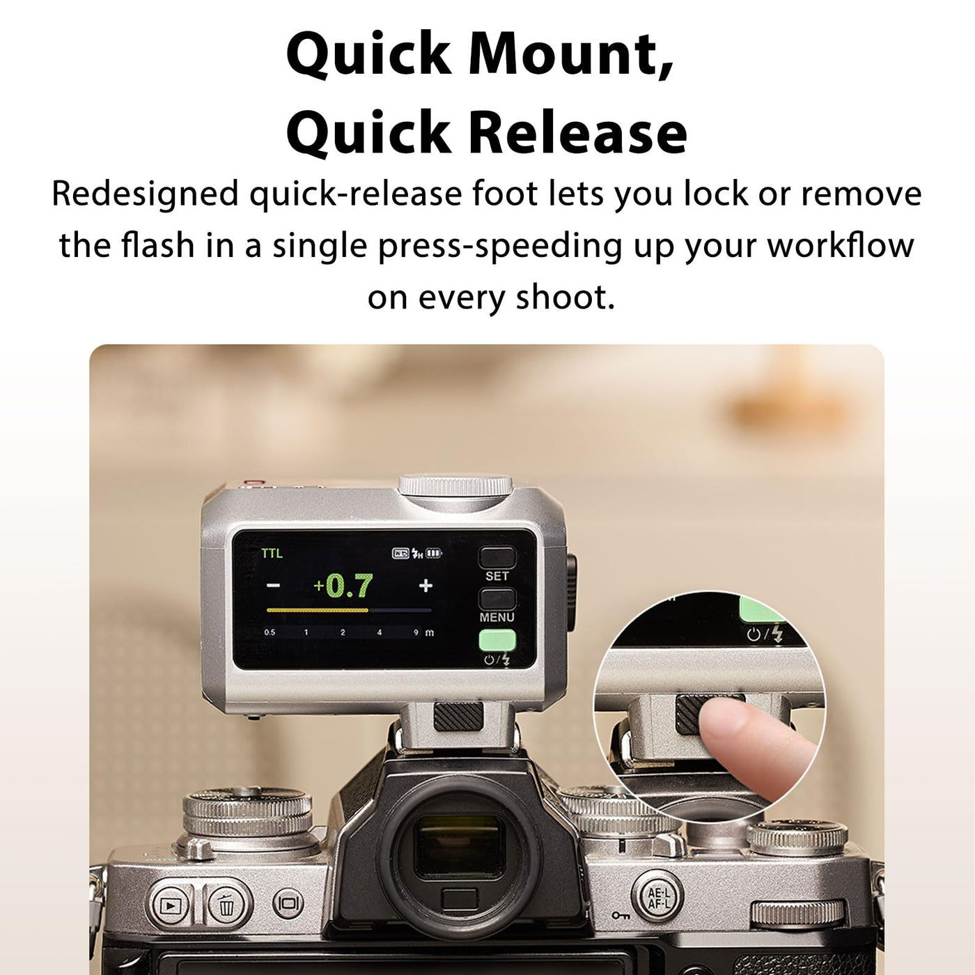 - Versatile Lighting Options: Featuring a built-in diffuser, this Portable Flashlight offers soft, flattering light, ideal for portraits or event photography. With high-speed sync of up to 1/8000 seconds, you can freeze motion or blend the flash with ambient light effortlessly.