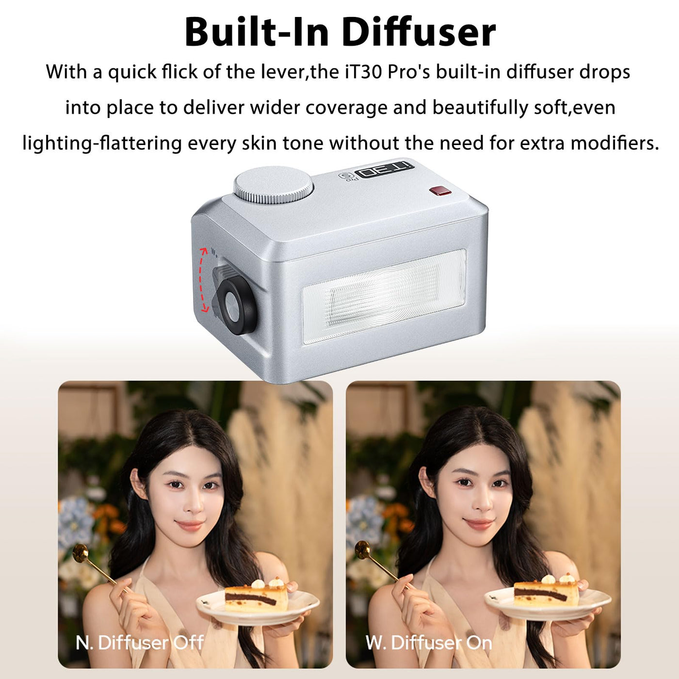 - Compact and Lightweight Design: The iT30 Pro Camera Flashlight weighs only 120g, making it an incredibly Portable Flashlight for Camera that you can easily carry on your shoots, ensuring you're always ready to photos stunning images in any lighting conditions.