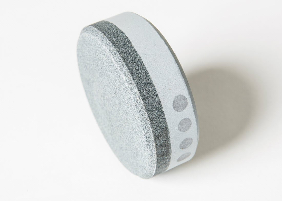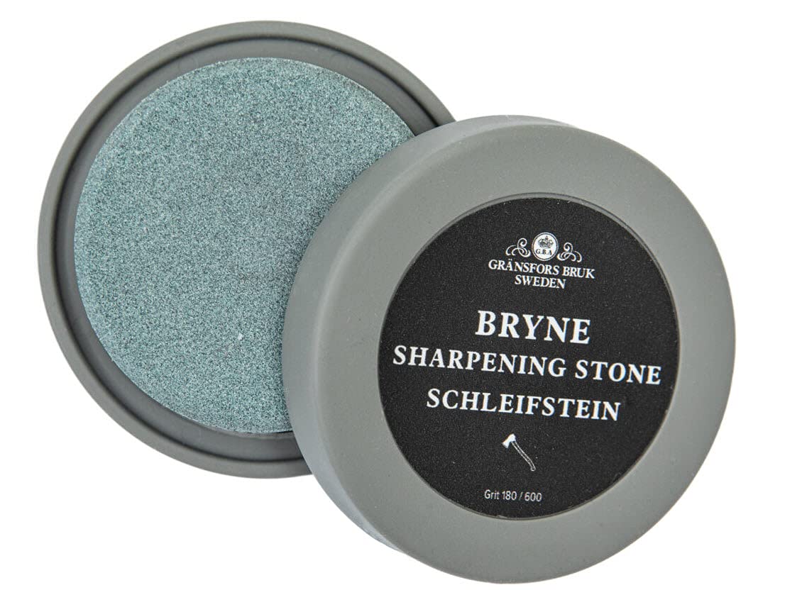 The Gransfors Ceramic Grinding Stone is a man-made sharpening stone with two grinding faces: a course side (180 grit) for repairing damage and heavy wear, and a fine side (600 grit) for sharpening. The ceramic composite makes the stone both durable and strong. In contrast to natural sandstone, a ceramic grinding stone can be given a more precise grain size. Its shape is round and flat with a bevelled edge to prevent chipping. The fine side is 2/3 of the thickness, as this side is usually used and worn down most. The stone is normally used with water but can be used dry. The stone comes in a protective rubber case.