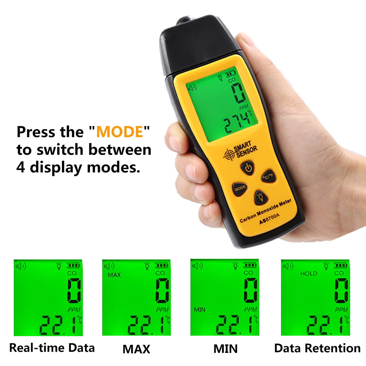 Handheld Carbon Monoxide Meter, 80db Light CO Leak Detector, Portable Handheld CO Detector, CO Gas Analyzer with LCD Display, 0-1000 ppm High Precision