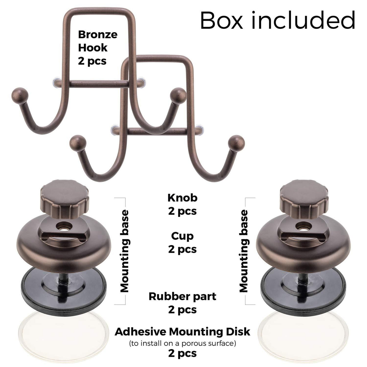 Don't your hooks on the suction cups stay on the wall for a long time? Is it just a few days before the suction cup stops working? We offer one of the best vacuum suction systems for mounting – Super Suctionfix. You are not going to worry that the fixing is not strong enough now. The time-proven system is one of the best among the competitors and holds the load of about 22 lbs. The suction cup is made of natural rubber, and the hook is stainless steel, which guarantees secure fixation and long operation time. Bronze coating ensures the excellent look, and the quality of the materials is verified by numerous tests. If you rent a flat or move frequently, and the landlord does not allow drilling the walls to fasten towel racks that you need, then our product is just for you. You are totally independent and can attach our hook to the suction cup wherever you want, and take it with you when you move out. Suction works best on ceramic tile, glass, mirror, stainless steel, acrylic, plastic, laminate and any non-porous smooth surfaces. We are confident in our product, so we guarantee 100% refund of money you spent if the fixing is not strong enough for you or you do not like the quality of the materials. So Don't Delay... Scroll back up the top of this page and purchase with confidence. Material Type: Hook - stainless steel. Cap and knob – plastic. Suction cap - rubber. ATTENTION: Suction will not work over grout lines or on porous surfaces, such as: wood, porcelain, marble, wallpaper, natural stones such as Travertines, painted wall & any surface that is bumpy, etc...