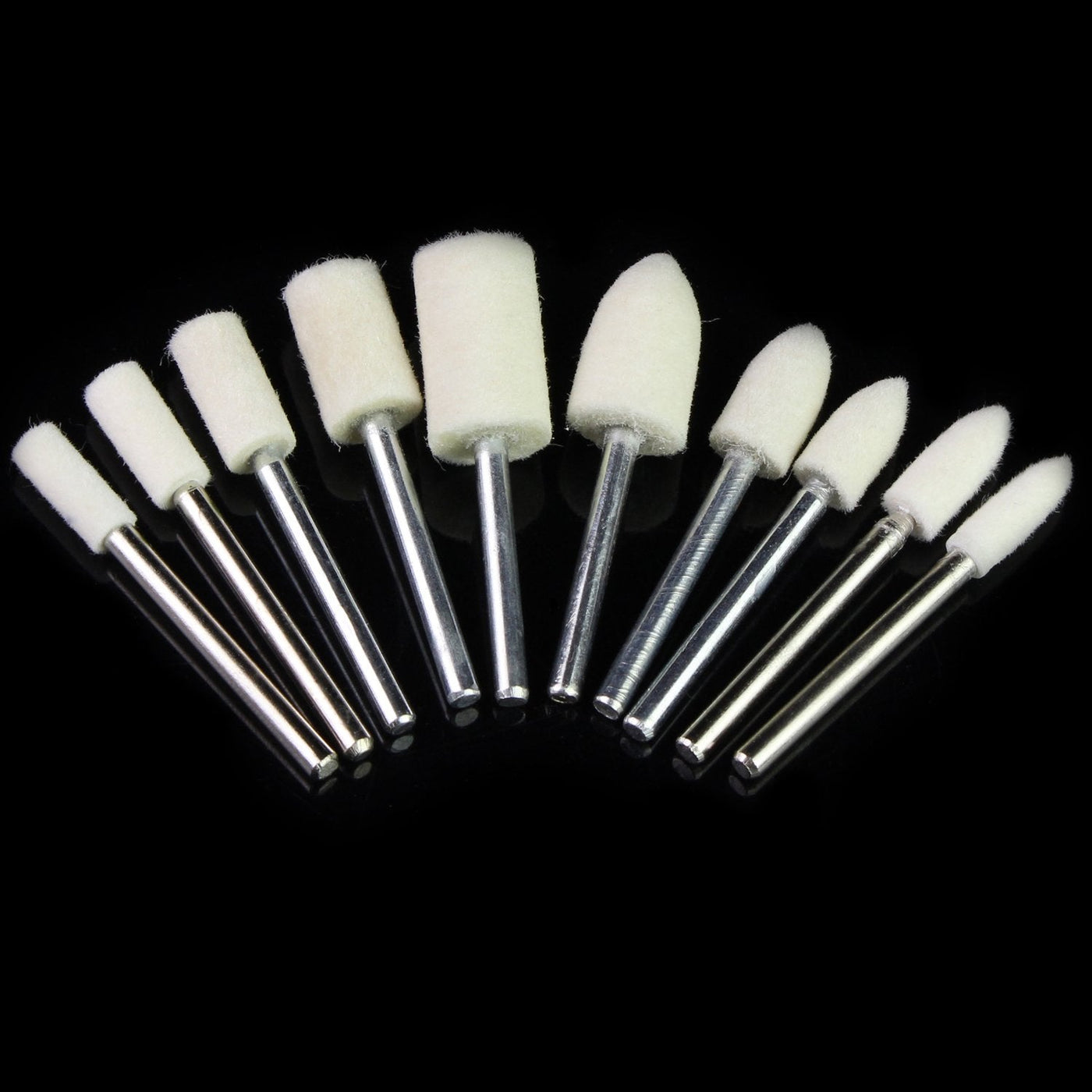 Product Description These high quality wool felt mounted grinding heads are soft with smooth and refined Surface. Work very well for polishing metal-on-metal parts, cleaning, polishing jewelry, gemstones, glass, watches, crystal, triggers, lining ramps, car, motorcycle engine parts, various shapes etc. Specifications: Material: high quality wool, metal 50 Cylindrical grinding heads (diameter: 10mm/8mm/6mm/5mm/4mm) 50 spherical grinding heads (diameter: 10mm/8mm/6mm/5mm/4mm) Color: White + Silver Shank size: 1/8inch (3mm) Package includes: 100X Wool Felt Mandrel Mounted Polishing Head