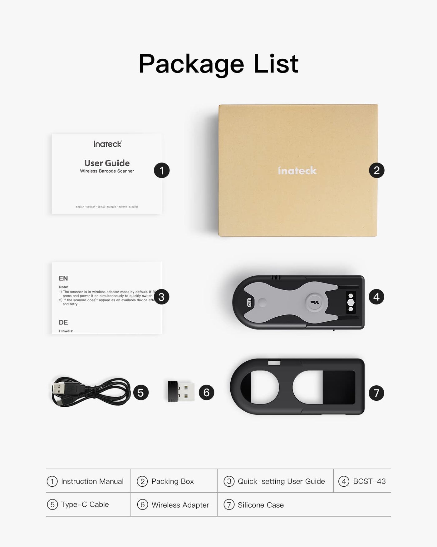 - Packing List: BCST-43 *1, Type-C Cable *1, 2.4G Adapter *1, Silicone Protective Case *1, Quick-setting User Guide*1, Instruction Manual *1.