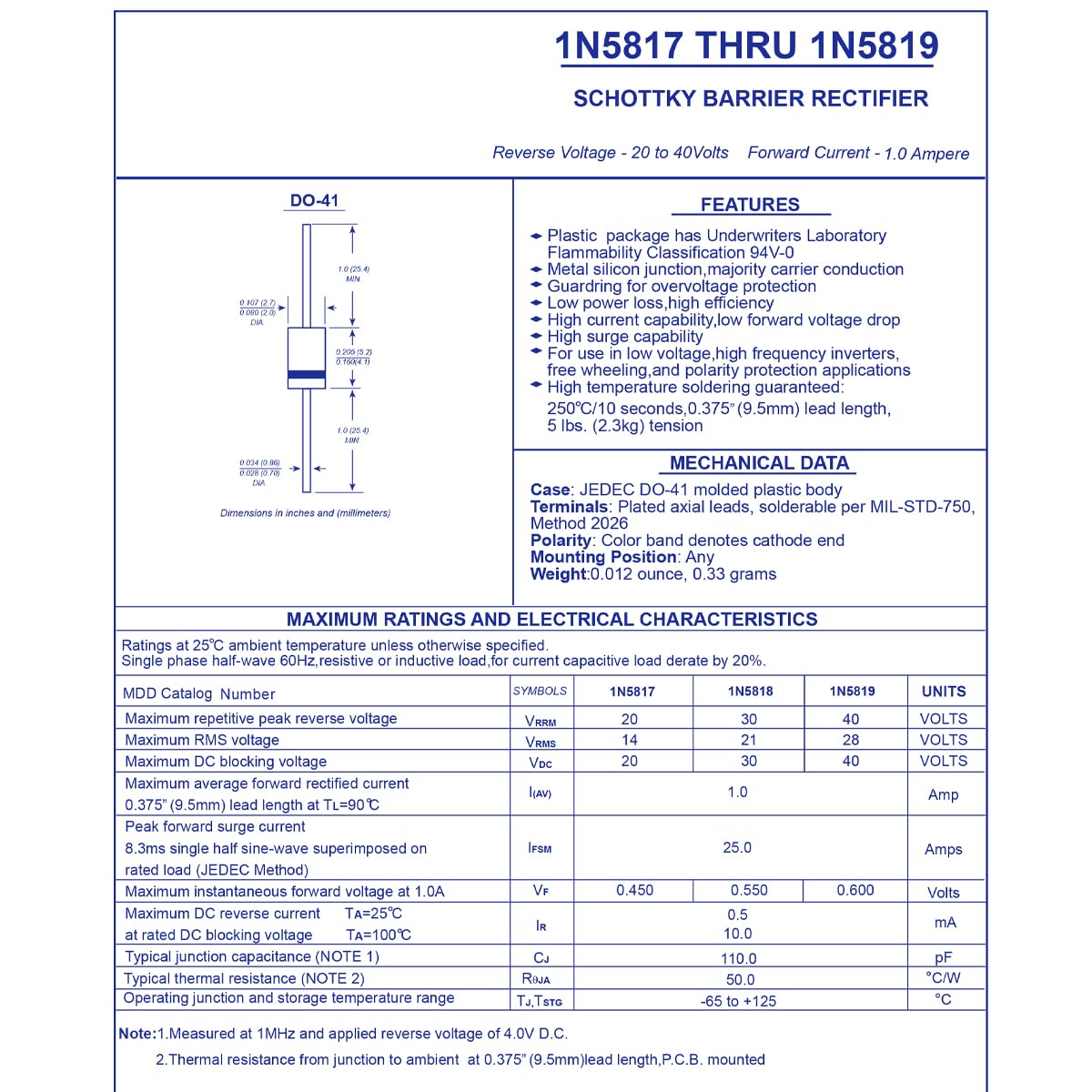 - Forward current: 1A, Maximum Repetitive Peak Reverse Volate: 20V