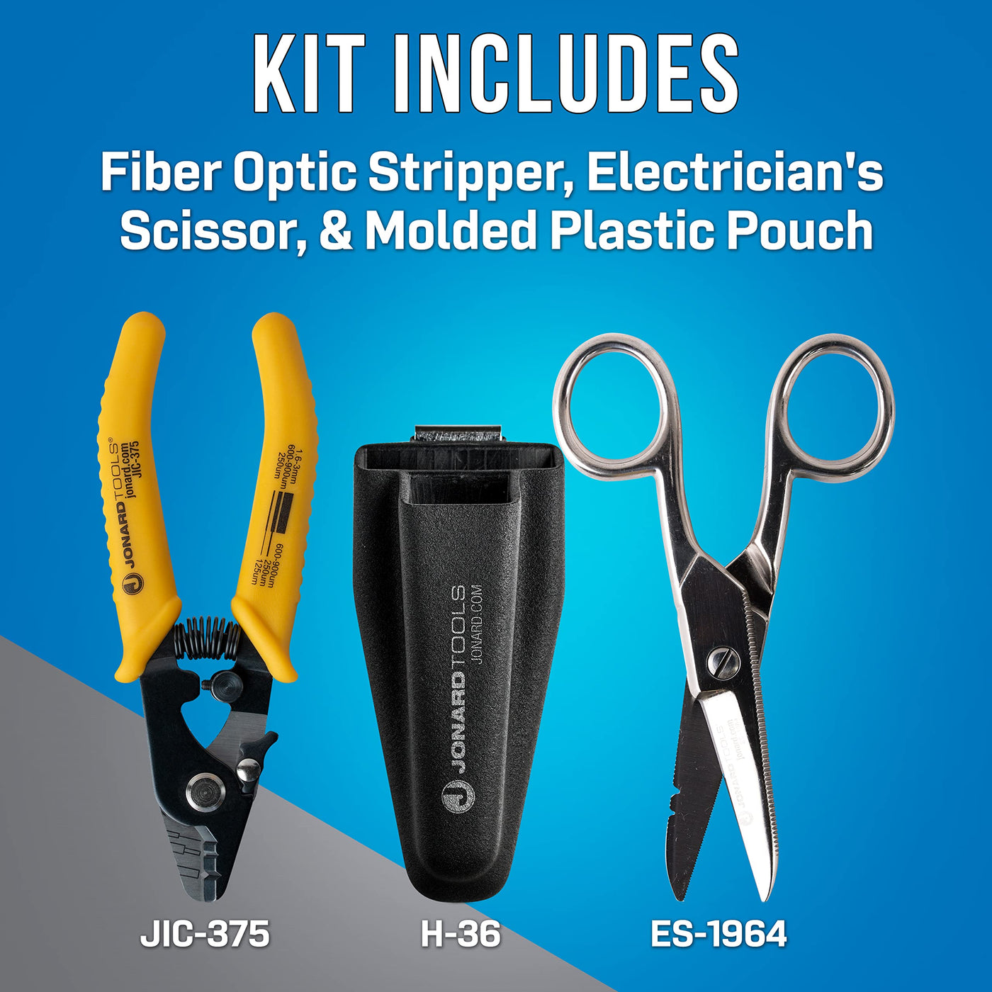 Kit includes the JIC-375 fiber optic stripper, ES-1964 Electricians scissor, and convenient molded plastic pouch(with belt loop).