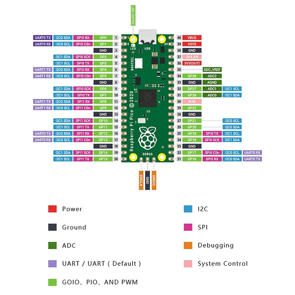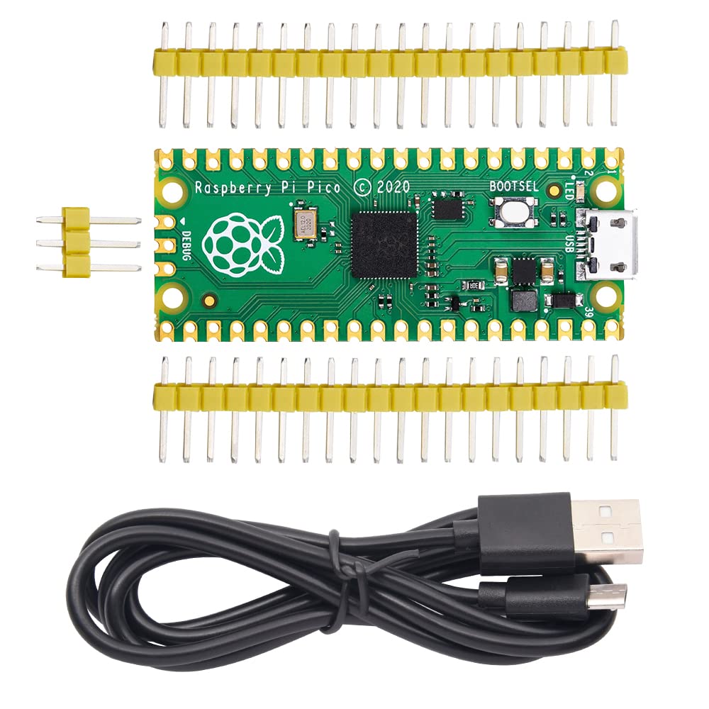 Overview: Raspberry Pi Pico is a low-cost, high-performance microcontroller board with flexible digital interfaces. It incorporates Raspberry Pi's own RP2040 microcontroller chip, with a dual-core Arm Cortex M0+ processor running up to 133 MHz, embedded 264KB of SRAM, and 2MB of onboard Flash memory, as well as 26x multi-function GPIO pins. For software development, either Raspberry Pi's C/C++ SDK or the MicroPython is available. There are also complete development resources and tutorials to help you get started easily, and integrate it into end products quickly. Features: Raspberry Pi Pico Board, a tiny,fast and versatile microcontroller board .Built Using Microcontroller Chip Designed By Raspberry Pi. C/C++,MicroPython Support.Comprehensive SDK, Dev Resources, Tutorials To Help You Easily Get Started Dual-Core Arm Processor.Dual-Core Arm Cortex M0+ Processor, Flexible Clock Running Up To 133 MHz 26 × Multi-Function GPIO Pins.Configurable Pin Function, Allows Flexible Development And Integration Package Contains: Raspberry Pi Pico with 2 pin headers(not soldered) x1 3PIN yellow pin header x1 USB-A to micro-B cable x1 Note: Provide Technical Support, please contact us if you have any problem.