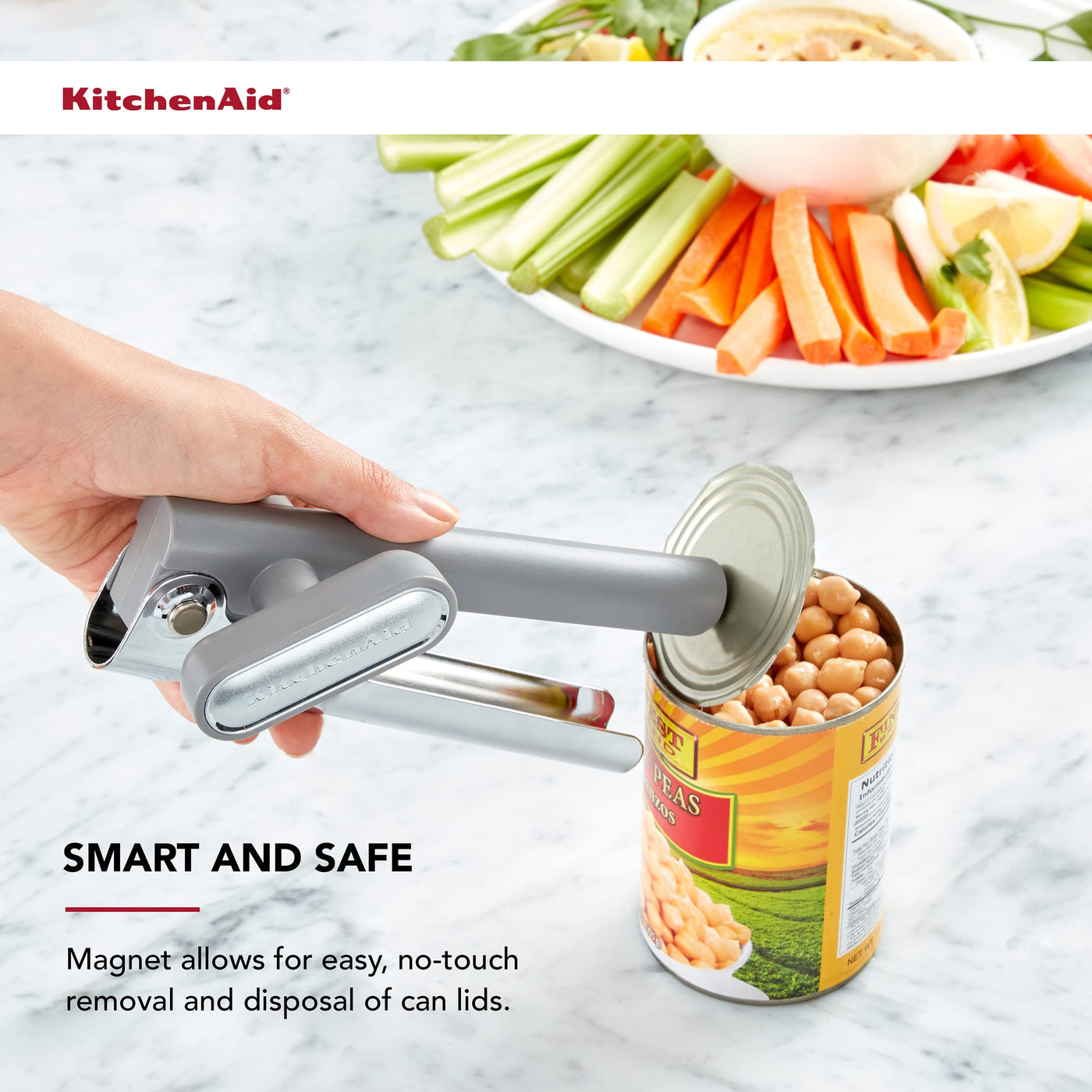 The KitchenAid No Mess Multifunction Can Opener features a razor-sharp, high- carbon steel blade that easily pierces and slices through any sized can with a smooth, continuous cut. The magnet in the end of the handle allows for easy, no-touch removal and disposal of can lids, while the oversized, easy-crank knob allows for effortless opening with just a few turns. The ergonomic handles are well balanced to ensure maximum comfort and smooth operation, and the sturdy design stands up to daily use. Hand wash with warm water and a mild detergent. Rinse and dry immediately.