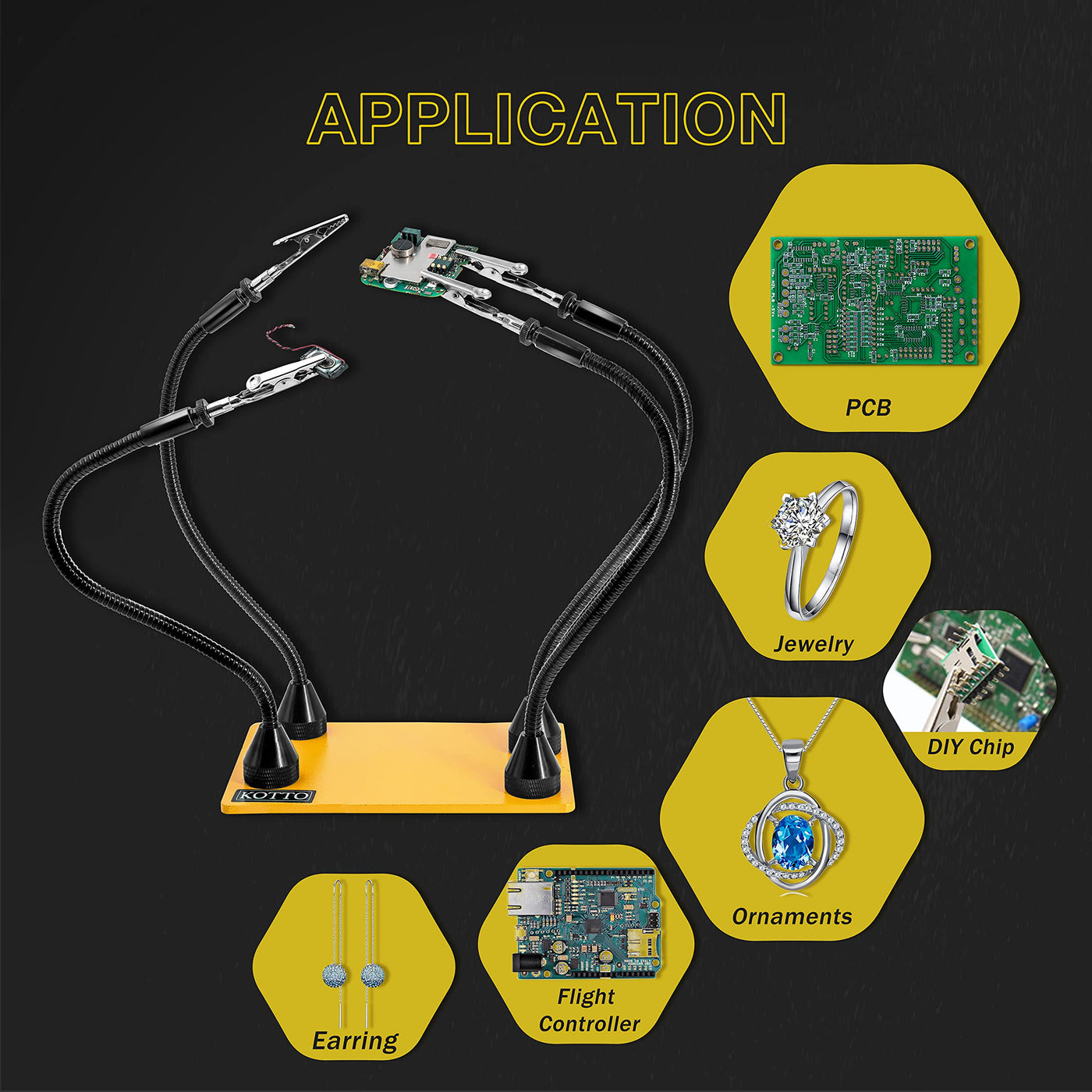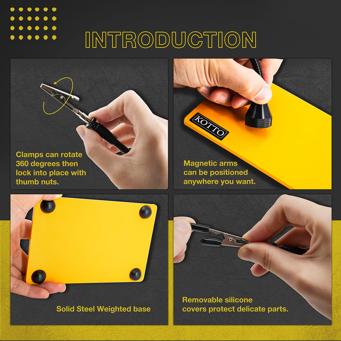 - Every detail coveredWe love tools! You could say we're obsessed. That's why we build quality into all Kotto products down to the smallest detail. The alligator clips of this multifunctional helping hand are made of stainless steel. Our thoughtful design allows the alligator clips to easily rotate 360 degrees while still being strong enough to hold larger projects.