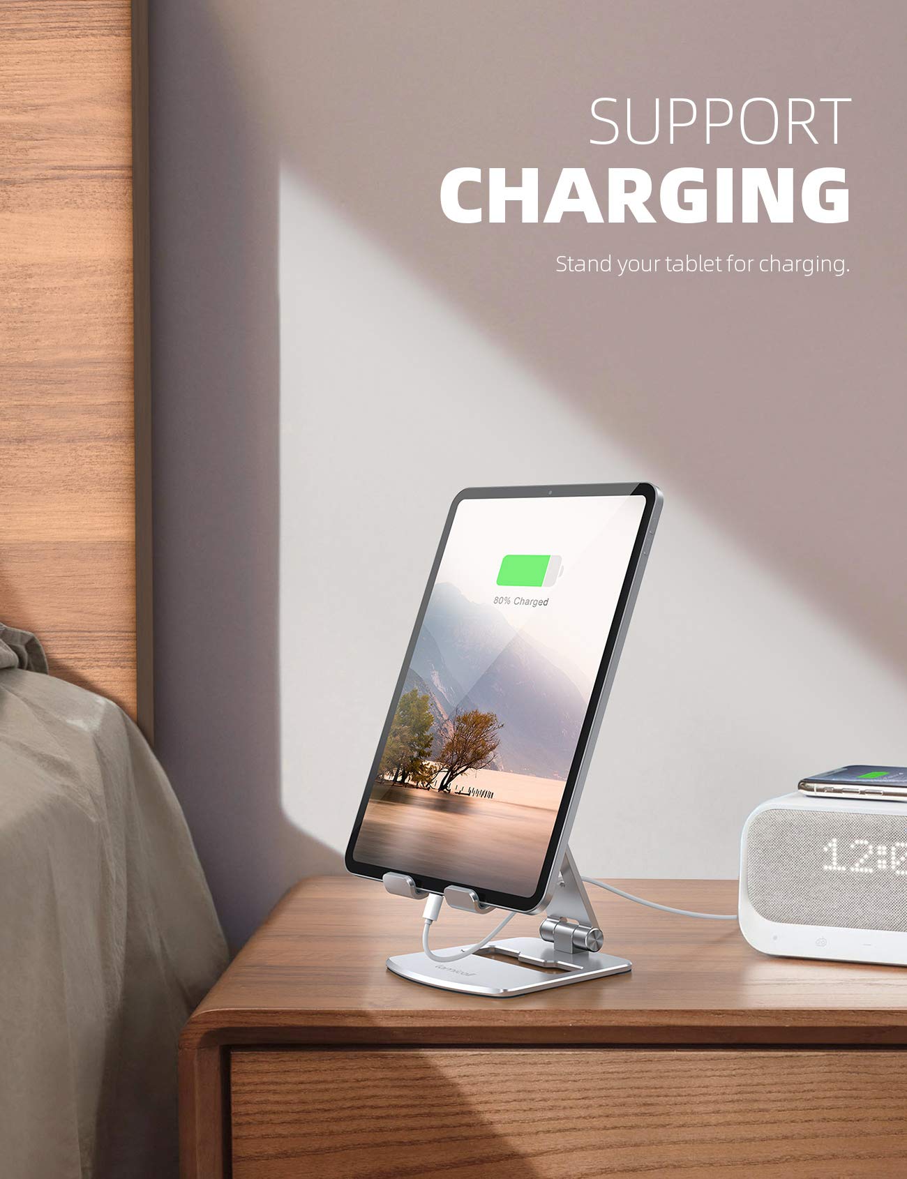 - Light weight & Sturdy Thanks to high-quality aluminum alloy and the larger heavier base, Lamicall desktop ipad charging dock stand provides solid support to hold your tablet in the upright position without falling over like others.