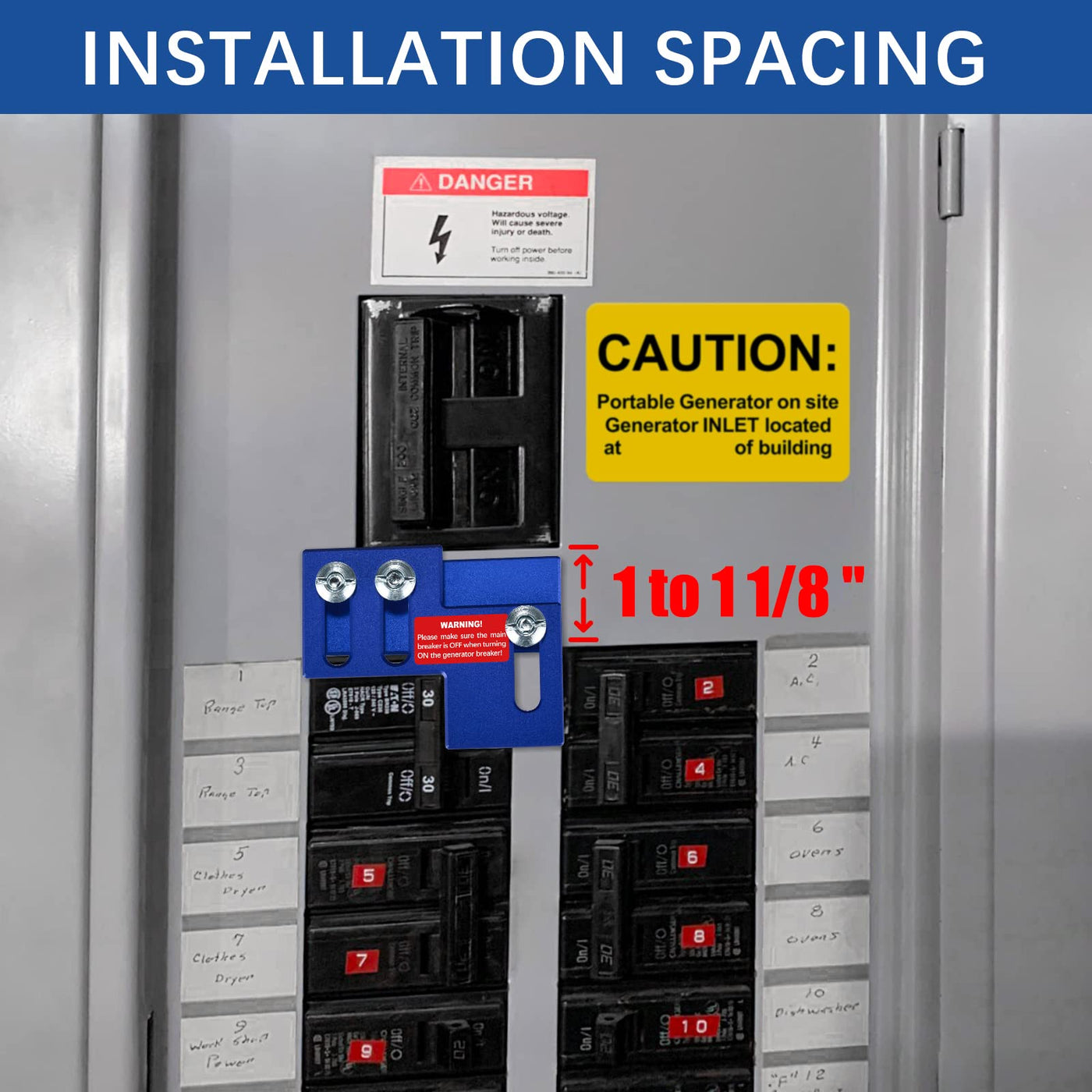 LATING Anodized Generator Interlock Kit for Thomas and Betts, Challenger and Westinghouse Main Panels 150 or 200 Amp, Blue Why is a generator interlock device so important? With aging electrical infrastructure and frequent severe weather, the power to your home frequently trips, which affects thousands of families nationwide. However, this can be very dangerous when both our utility and generator are used at the same time, causing circuit loads to burn out or generators to burn out, etc..The National Electric Code Requires a Generator Interlock Device When Powering a Breaker Panel with a Generator. Failure to Install an Interlock Could Have Fatal Consequences to a Lineman or Utility Worker! How It Works? When moved down, the plate blocks the generator back feed circuit breaker and allows the main breaker to remain ON. When moved up, the generator back feed circuit breaker may be turned ON, but the main circuit breaker is blocked and will remain OFF. What is a generator interlock kit? Generator interlock kit consists of two sliding metal plates held together by three bolts. It is a device just manual slide up and down interlock plate to allow safe back feeding of your home through a portable generator during power outages, preventing both utility and generator supplies from being ON at the same time. It’s used to direct the generator power to any circuit in your house safely in the event of an unexpected power outage, so that you can use electricity normally. Read more EASY TO INSTALL THE INTERLOCK KIT: Step1. Power Off Power off, place the bottom plate(holes only) EXACTLY as shown and then use the pen to mark holes through the bottom plate's holes. Step2. Drill Holes Remove the panel cover from the breaker panel and drill the three holes marked on the panel cover using the supplied 3/16'' drill bit. Step3. Install Interlock Insert the screws from rear of cover, install the bottom plate and top plate on the front cover of the breaker panel. Please make sure that the top plate can be pulled freely (enough space). Step4. Test The Interlock As shown, you see that the main breaker is ON, the generator breaker is OFF and can not be turned ON. The interlock has been properly installed. Lastly, apply all labels on electric panel. Read more Note: Only qualified personnel should be working on any panel box. An amateur should never open or work on a panel box. Please follow all rules and regulations of the National Electric Code. CNC Lathe, Precision Cutting Our professional lockout kits are made of heavy gauge CNC machined aluminum alloy and be chamfered for a smooth surface. they will not cut the user's hand or break. Anodized Surface Treatment This breaker interlock kit for generator is anodized surface treatment for a beautiful and long lasting professional appearance. You will love it! Drill Bit And Screws Supplied drill bit is made of steel and plated with PVD titanium on the surface with a metallic appearance, not fading, high hardness and wear resistance.The surface of our screws is galvanized, which is not easy to rust and durable. Read more