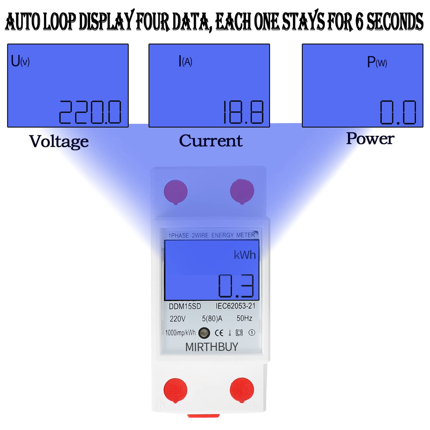 "Specification: Model: DDM15SD- 230V Rated voltage: 230V AC Rated current: 5-80A Load capacity: 0.05Ib - Imax (direct access type) or 0.02Ib - Imax (access via transformer) Data display: LCD display Power display: Green light Electric energy pulse display: Red light (When a scanning signal is applied , it lights up for about 80ms)Mounting type: 35mm DIN railWorking environment: -25 55 ~ 55 degree Celsius, ≤95%RHSize: 78.5 36.5 mm / 3.09 1.44 inchPackage weight: Approx. 133 g / 4 .7 oz Package List: 1 Energy Meter 1 User Manual"