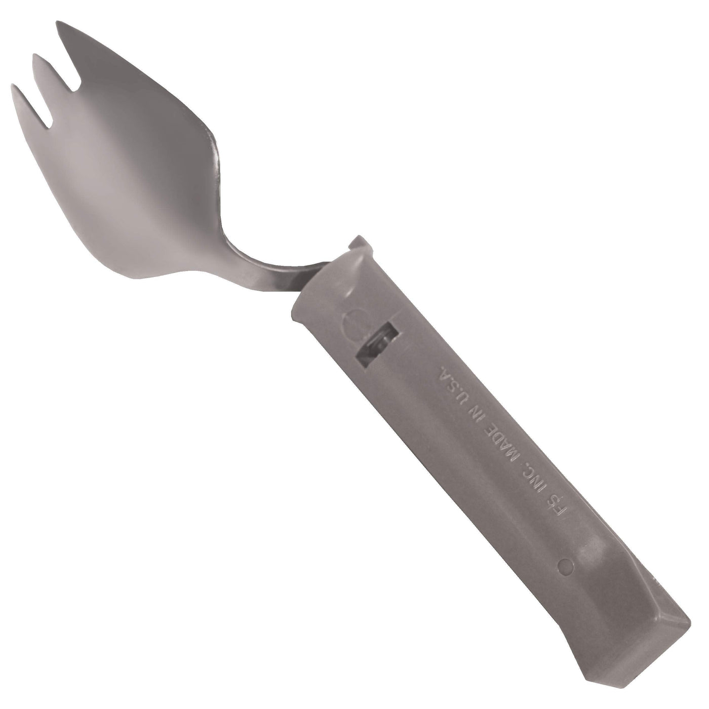 - Swivel Spork is made of durable stainless steel and attached to a lightweight plastic gray handle