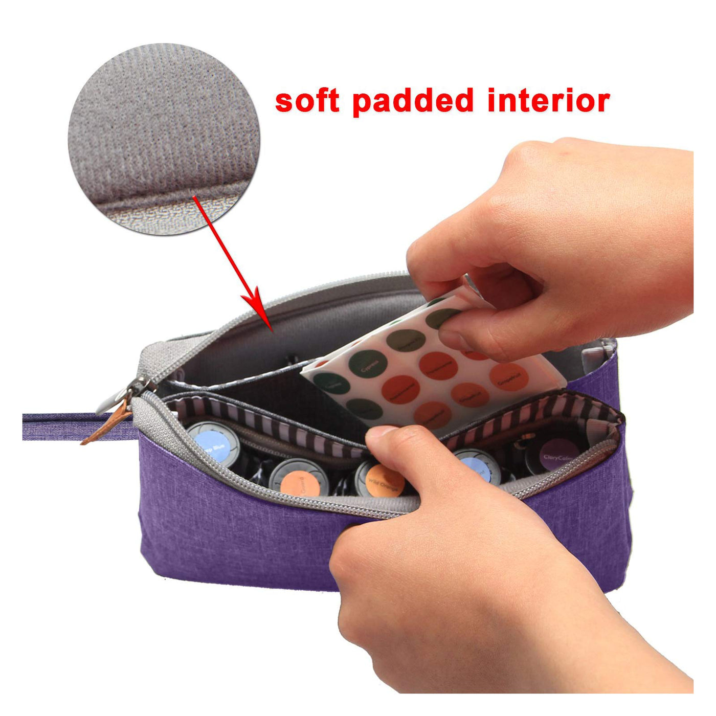 - Double Compartment: 9 oil holders for storing 9 bottles of 5ml-15ml essential oils. You can also put 2 roller bottles ( 10ml ) in one slot. An inner zipper pocket for storing openers, labels or other small accessories.