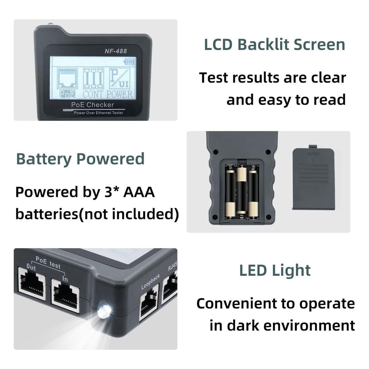 - Solution de test de reseau tout-en-un: The tester of cables RJ45 a ete meticuleusement concu pour rationaliser your processus de test de cables. The dispose of a suite of tests, and compris POE, CONT, Power, Loop-back, and a practical LED light. That you work with the cables CAT5e, CAT6 or CAT6a, the tester is your partner polyvalent.