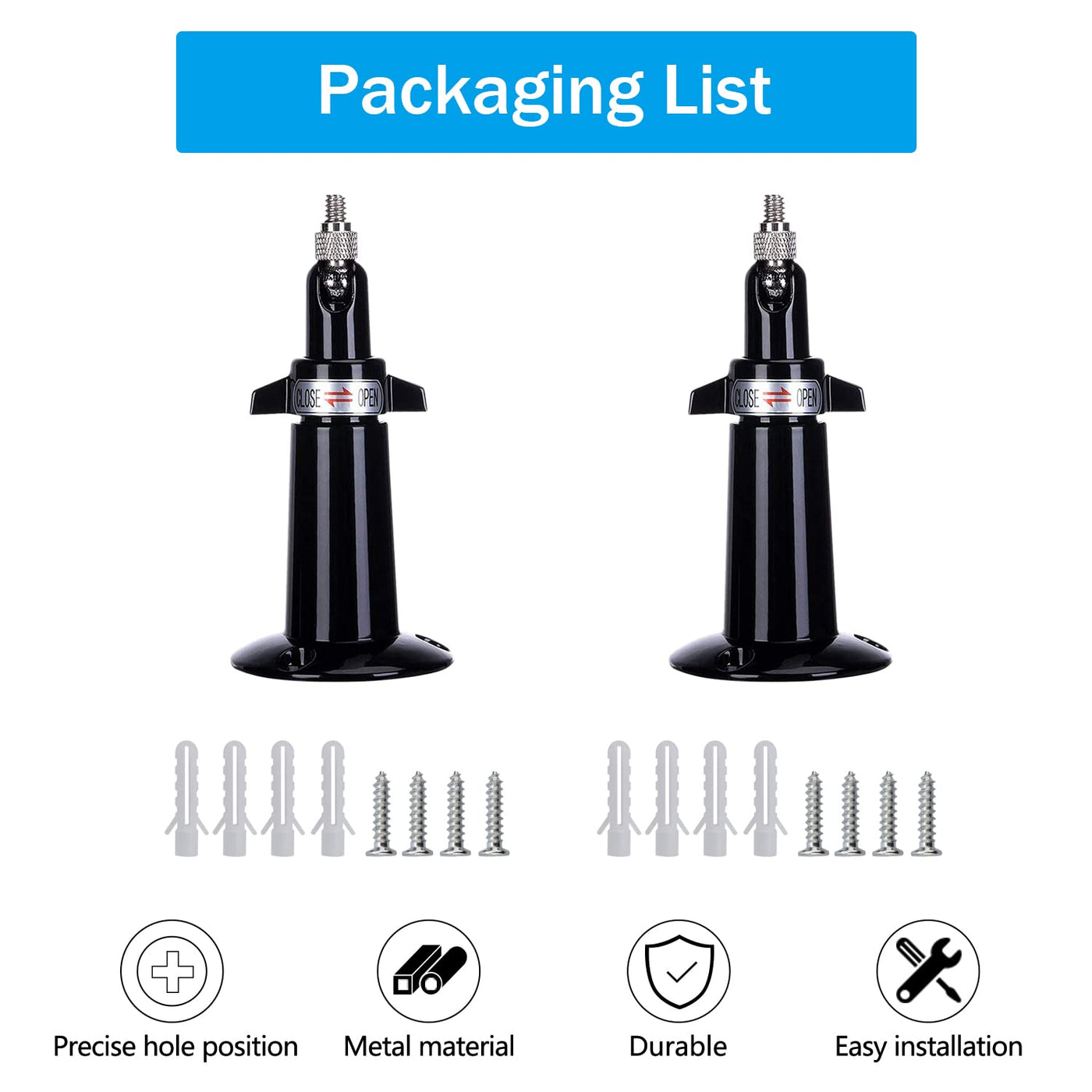 Haoyou Security Wall Mount Metal 2-Pack Height: 4 inch, Base: 2.2 inchMade of sturdy metal materialSuitable for indoor/outdoor/wall/ceiling/treeEasily adjustable 360 degree swivel and 90 degree tiltPerfectly compatible with all cameras with standard 1/4 threaded holes What's in the box 2× Ring stick up cam Mount 8x Screws 8x Wall plugs 2x Installation diagram Read more