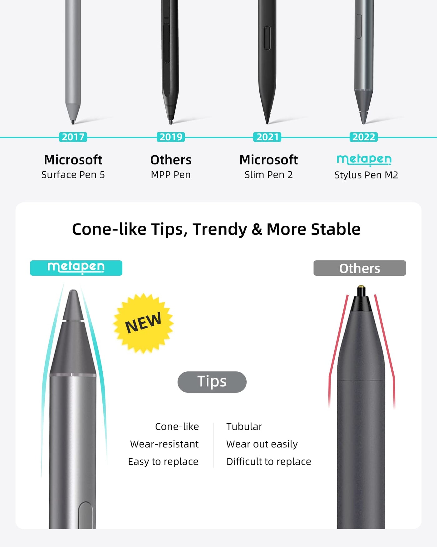 - [Cone-like Tips for Stronger Signal] Differing from the old-fashioned styluses with tubular tips, Metapen TIP302 enjoys a conelike tip for stronger signals and a more streamlined design on the whole.
