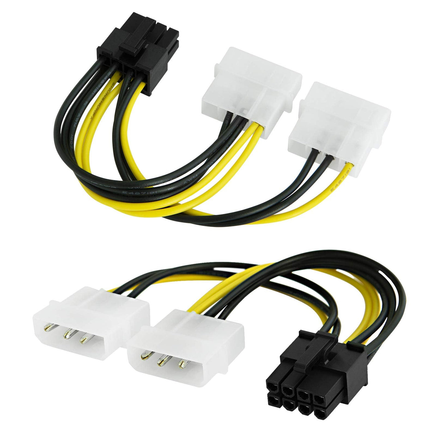 - Dual 4-pin Molex to 8-pin PCIe cable connects a video graphics card with 8-pin PCIe port to PSU with legacy LP4 Molex ports