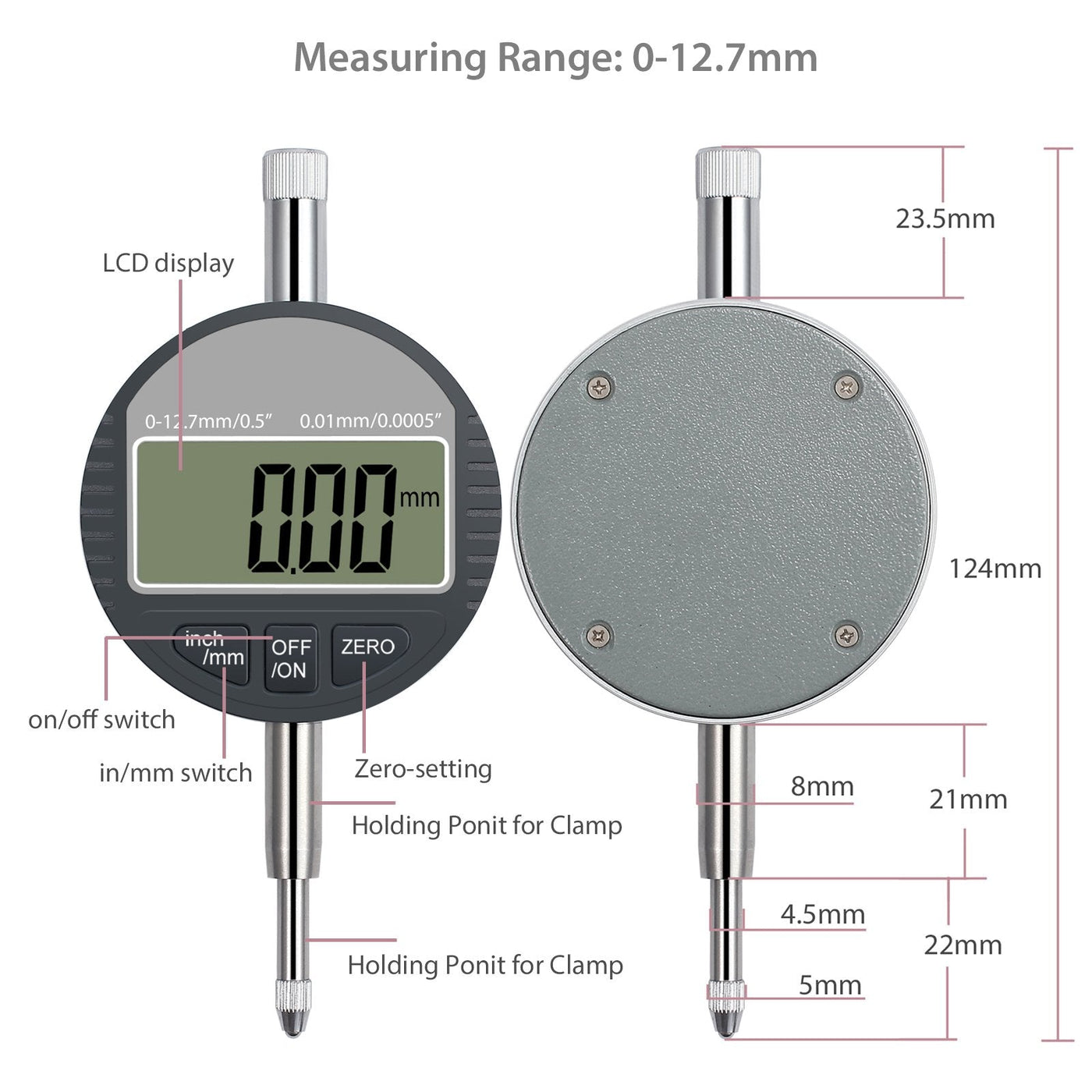 - Measuring range of 0~12.7mm, high resolution up to 0.01mm (0.0005")
