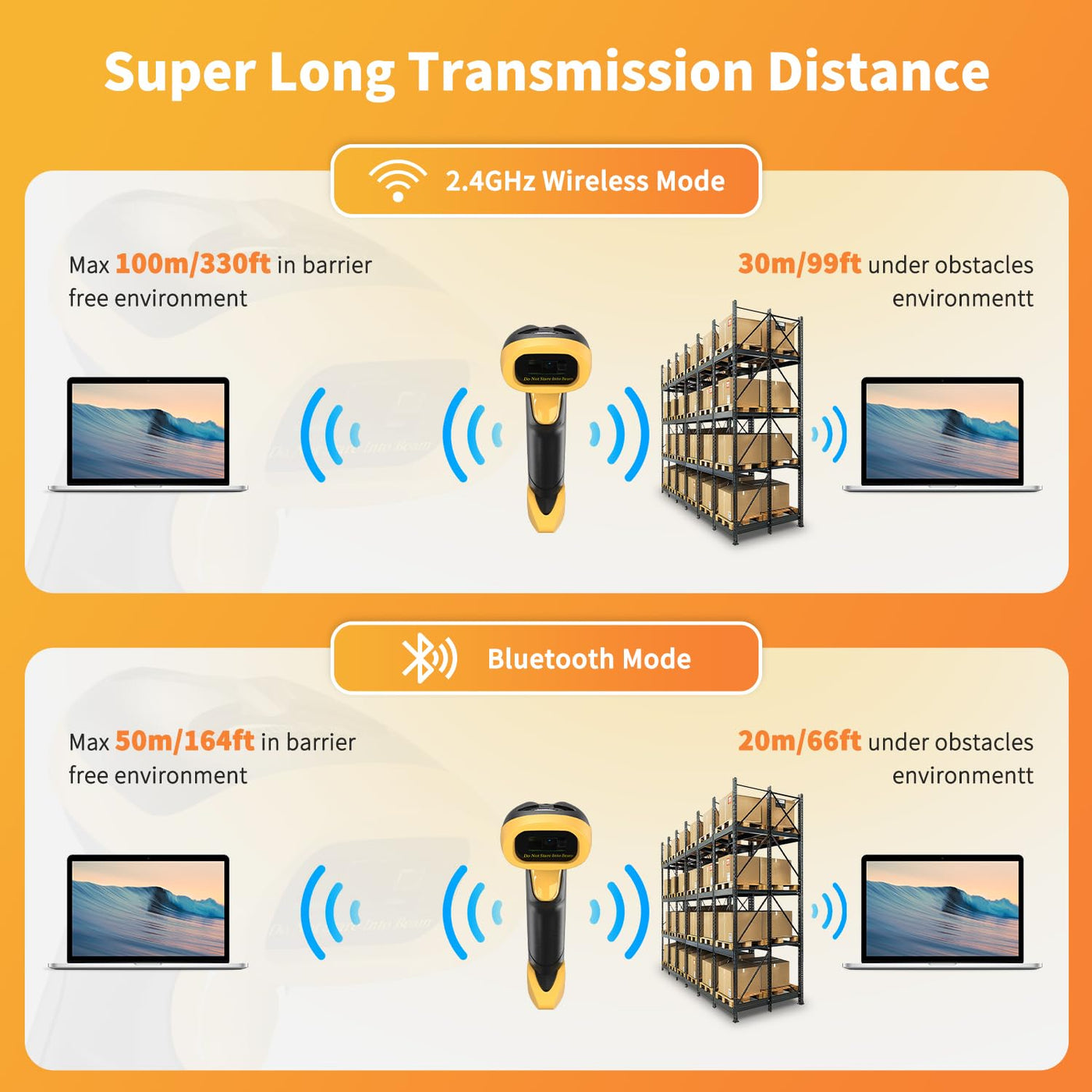 - Auto Scanning & Storage Mode - Manual Scan & Auto-sensing Scan & Continuous Scan. Two working mode: Instant upload mode / storage mode. Scan and store barcodes, then update the data to your device when you come back entering the wireless transmission range. Sometimes the self-sensing scanning function is in the inactive stage, please contact us and be at your service at any time.