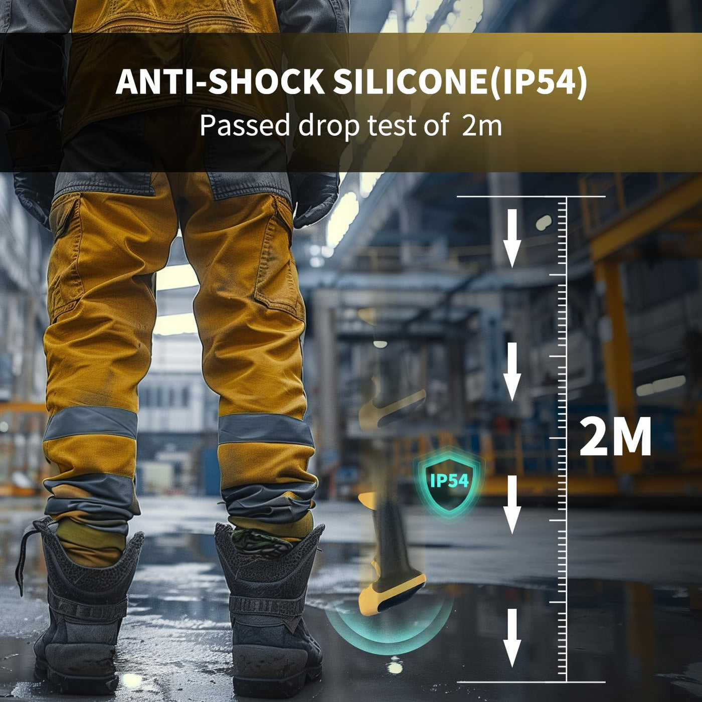 - Professional Anti-Shock Design - Made of great ABS+PC materials,high shock-resistant, and the silicone protective cover can avoid the scratches and friction while falling from the height of 6.57 feet; the technical of IP54 sturdy which protect the wireless barcode scanner from dust and moisture.