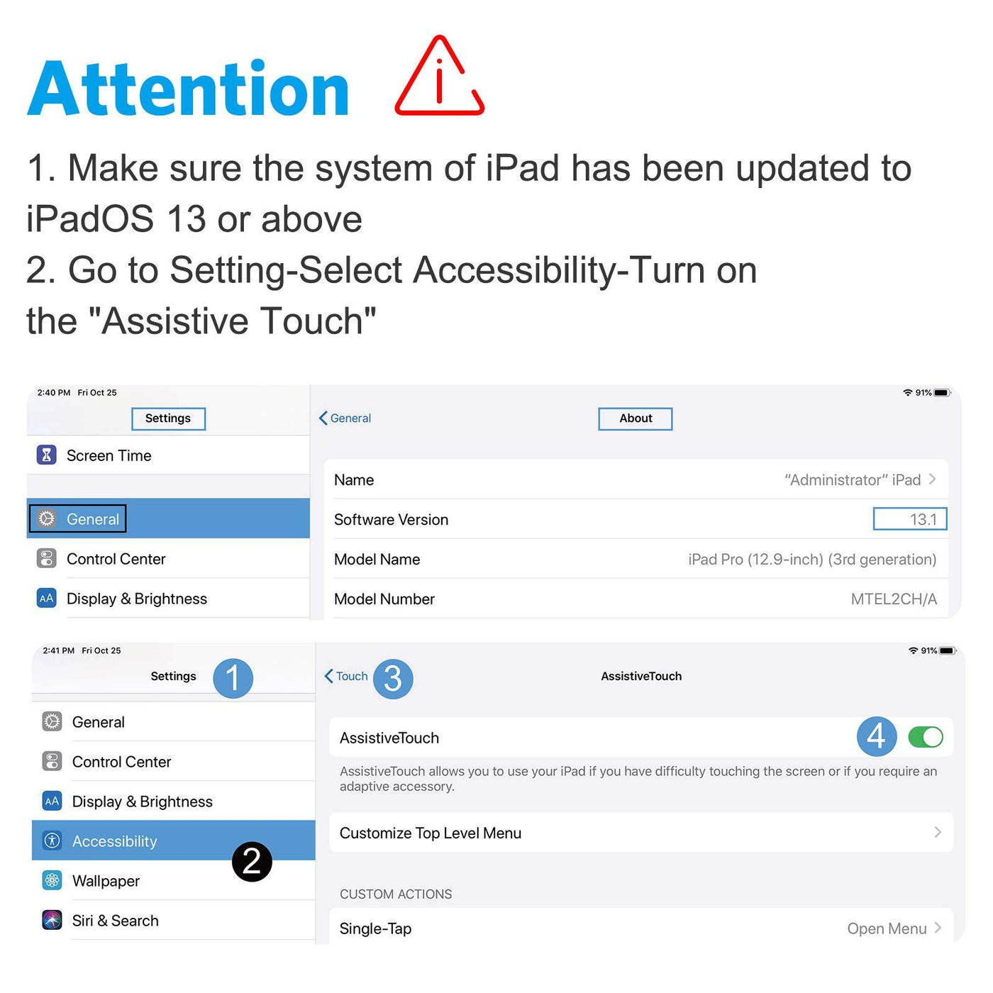 iPad Keyboard and Mouse iPad Keyboard and Mouse iPad Keyboard and Mouse Supported System iPadOS/iOS 13 and Above iPadOS/iOS 13 and Above iPadOS/iOS 13 and Above Size 16.30 x 5.35 x 1.37 inch 13.74 x 4.72 x 1.18 inch 14.50 x 5.35 x1.18 inch Weight 17.98 ounces 11.70 ounces 14.46 ounces Batteries Required 1 AA battery,2 X AAA Batteries 1 AA battery,2 X AAA Batteries 1 AA battery,2 X AAA Batteries Wireless Range 10m (33 ft) 10m (33 ft) 10m (33 ft) Read more Read more OMOTON Wireless Bluetooth Keyboard and Mouse Combo for iPad and iPhone Pro Tips: 1. This keyboard and mouse combo is only compatible with iPadOS 13 or above system. Please make sure the system has been updated. 2. You need to enable the “AssistiveTouch” function with the following steps to connect iPad : Setting - Accessibility - AssistiveTouch. 3. The keyboard and mouse will both automatically go into power savings mode after 10 minutes of inactivity. Press any key and wait 2-3 seconds to wake them. Package Includes: 1 x Wireless Keyboard 1 x Wireless Mouse 1 x User Manual