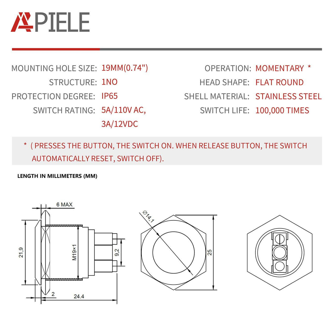 Read more Specification: Mounting Cut Hole: 19mm ( 0.74â€) Operation: Momentary Structure: 1NO Switch rating: 5A,12V AC/DC; 5A 110-250VAC Contact Material: Silver alloy Protection Degree: IP65 100,000 Times Electric Work Life. No LED Lamp APIELE Stainless Steel Push Button Switch This All Metal Switch Functions Manually As A Replacement Of Auto Refit, Boat Refit, Instruments Apparatus, Enter Guard, Household Appliance. It Provides Solid And Crisp Push Feedback And Comfortable Led Light. Ip65 Waterproof Make It Can Be Used In Humid Environment. Metal shell tolerates vibration and other harsh environmental conditions. The Improved Wire Diagram Come With The Switch And A Non-Electrical Person Can Install It Easy. Get A New One If Broken In 3 Years. Package Include: 2 PCS of APIELE Push Button Switch Read more Momentary switch Momentary switches only remain in their on stateas long as they're being pressed.Use this switch to replace the light switch, horn switch or other control switches in the cars/ boats/ trucks. IP65 Waterproof As it is full metal appearance and with a rubber ring, the switch achieves IP65 waterproof degree. It can used in wet environment, such as boat control panel, kitchen, outdoors etc. Note that this switch can be used under water. Wide Use Range It can use as a door bell, entrance guard push button switch in the outdoors.Also a good choice to use it as a replacement switch of household Appliances. Such as table lamp switch, PC switch, Audio switch. Read more 12mm Led Momentary Switch 12mm Pre-wired Led Momentary Switch 16mm Led Momentary Switch Mounting Hole Size 12mm 12mm 16mm Rated Amp 3A/12VDC 3A/12VDC 5A/12VDC 22mm 10A Led Momentary Switch 22MM Momentary Switch XB2 Type 22MM Momentary Switch LA36 Type Mounting Hole Size 22mm 22mm 22mm Rated Amp 10A/12VDC 10A/110-250VAC 10A/110-250VAC