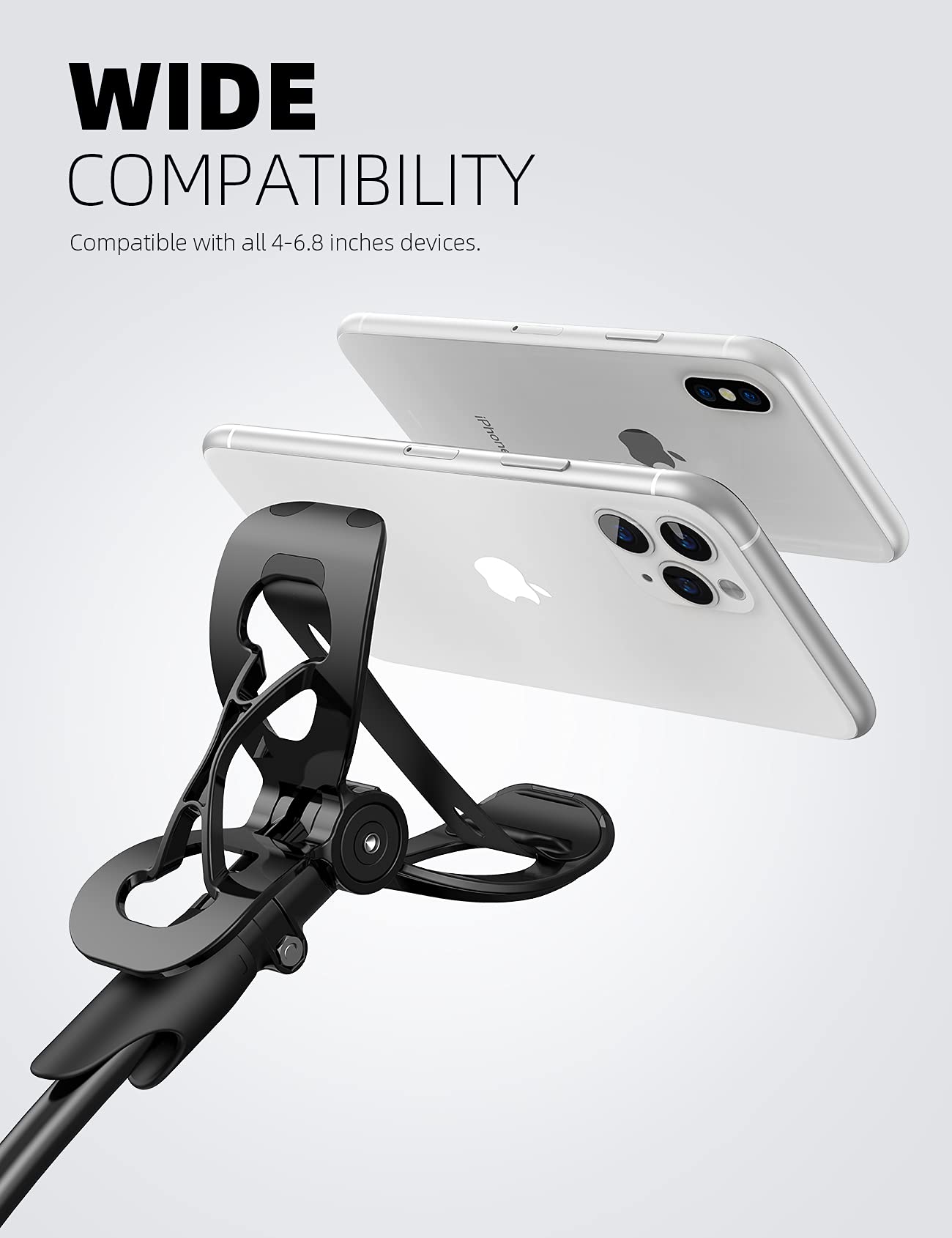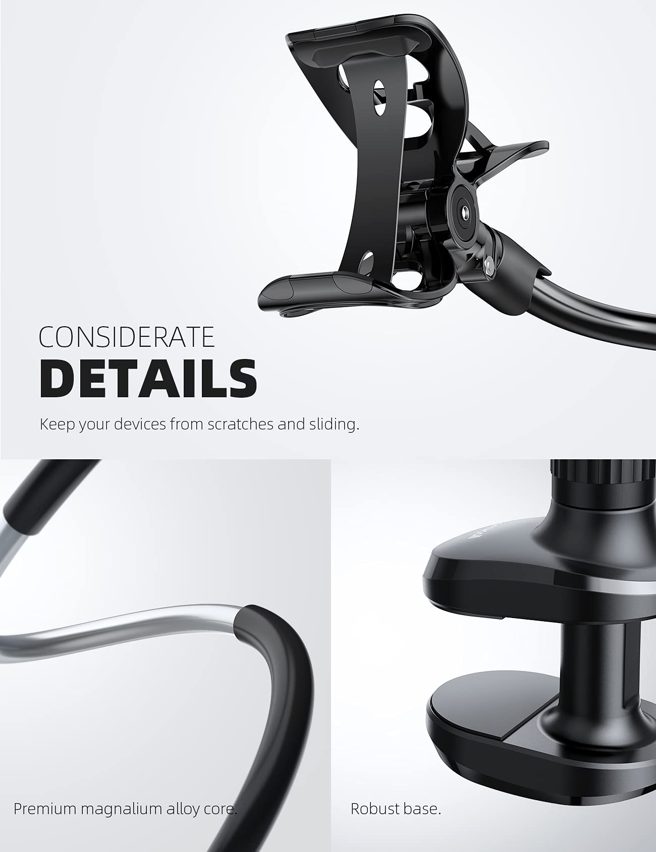- Flexible clip phone holder With 360 rotation clip on holder, flexible long gooseneck arm, you can freely adjust it to your best viewing angle when youre lying on your bed or sofa. Notice: Due to its flexible structure, there are wobbles while typing on the phone.