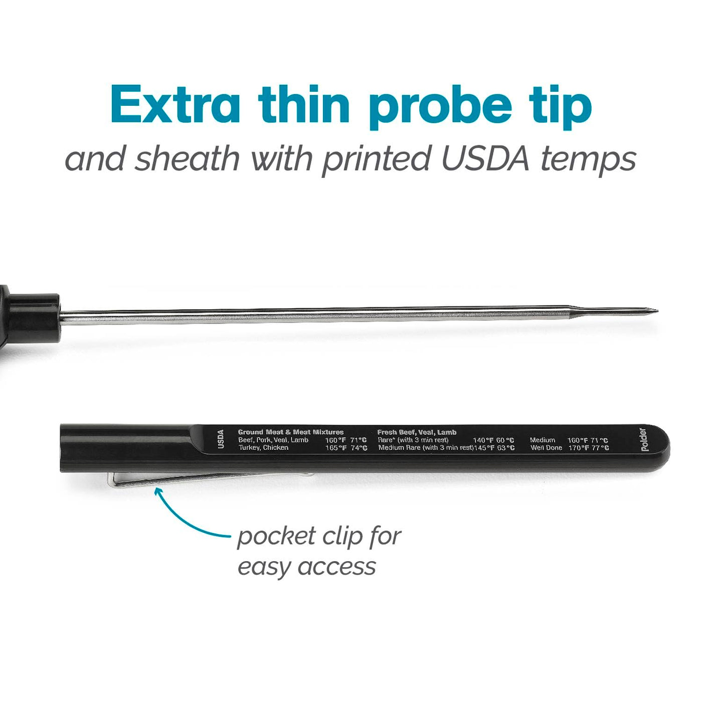 - Pocket clip attachment for easy access while cooking