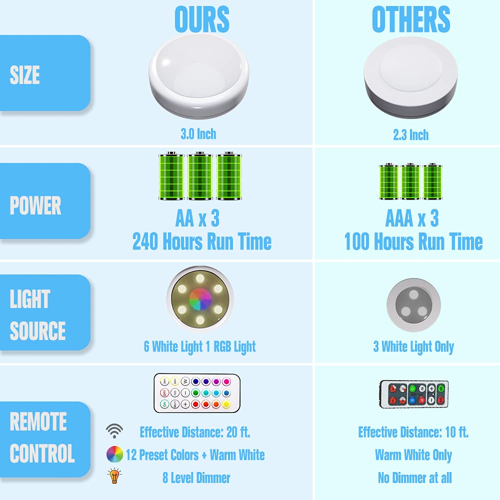 - Broad applicability & easy installation: Led Puck Lights can be applied in a variety of scenarios, such as kitchen, bedrooms, stairs, cupboards, corridor, counter, closet, pantry, etc. It is especially useful in under cabinets with insufficient lighting. Also as a colorful atmosphere lamp to adds a nice little update feel. Wireless design, stick it onto any surface with a 3M double adhesive tape (6 pcs incl). No drills, No screws and No Ugly Holes in the Furniture.