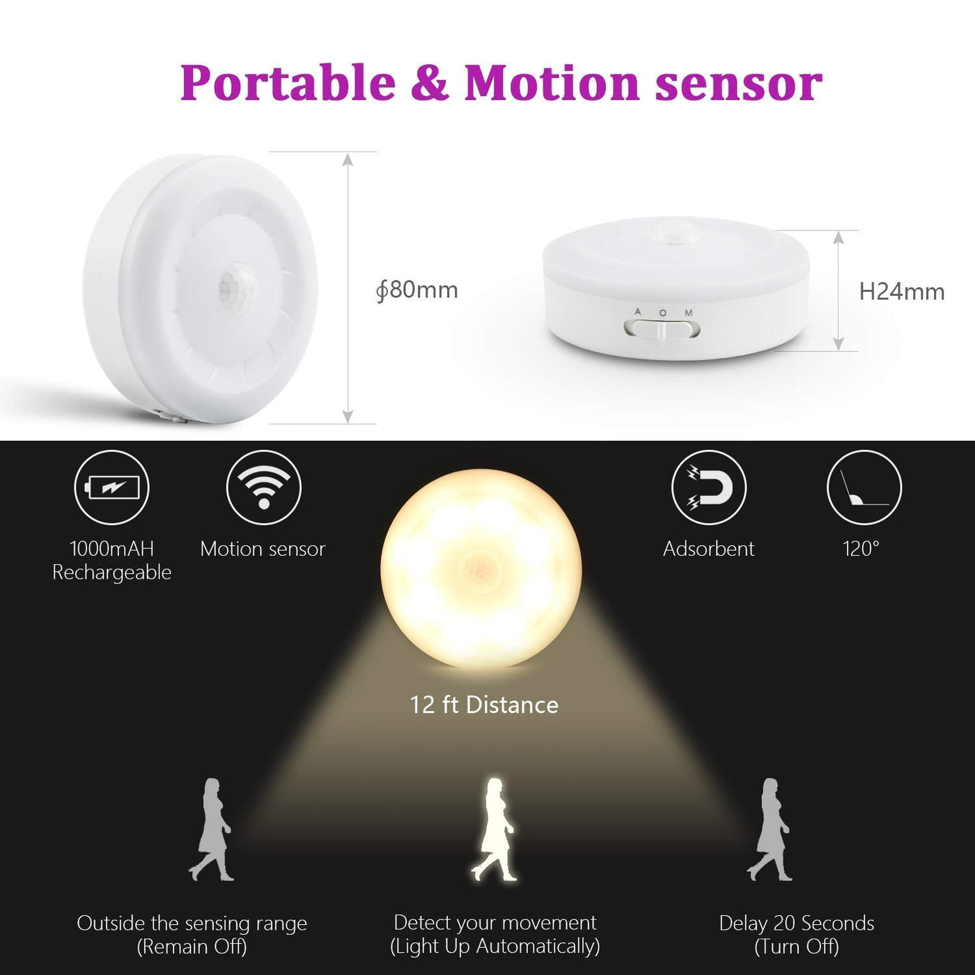- USB rechargeable and long time illumination: These sensor lights have built-in 1000maH rechargeable Li-polymer battery. No more waste money on AAA batteries!come with USB cable, compatible with power bank, phone charger, PC USB port