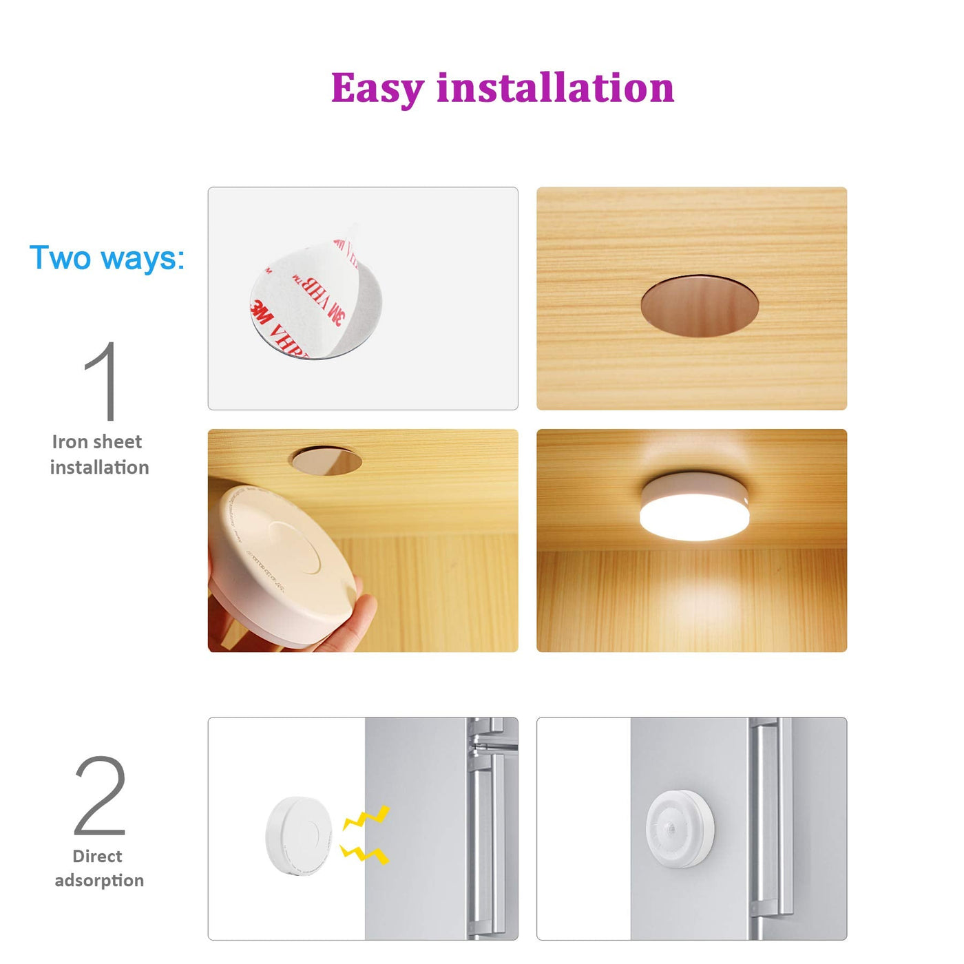 - Easy Installation: PIR night lights have built-in magnets, strong magnetic holds this light securely in place, or on non-metal surface with adhesive metal plate. It is safe and convenient and can be installed in seconds, the adhesive metal plates are absorbed on the back of puck light.
