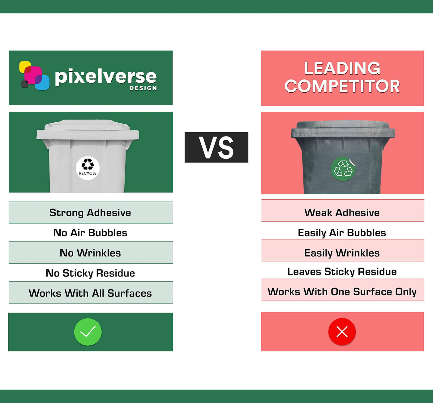 - SIMPLY UNBEATABLE - Don't stress about choosing between quality and price. This recycle logos and trash sign adhesives are affordable and long lasting. Made with the highest grade vinyl and a finishing coat of lamination, these durable decals offers trouble-free performance and does not leave sticky residues when removed. Unlike the gimmick of competitor brands, our non magnetic print is easy to use; simply peel, stick, and smooth out air bubbles with a credit card. There is no comparison.