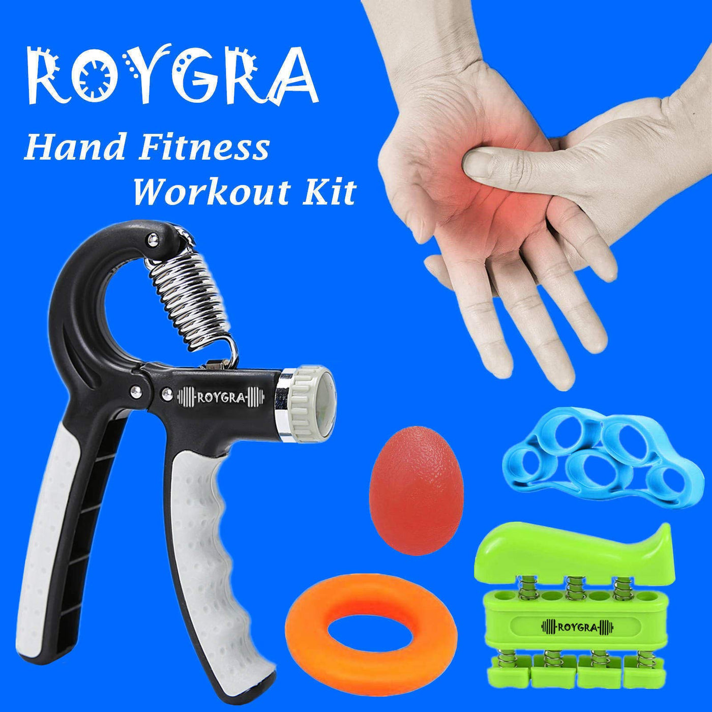 - Advanced hand grip strengthener each ROYGRA hand strengthener forearm grip workout set includes an adjustable grip strength trainer, finger strengthener, finger stretcher, and exercise ring to add more diversity to your forearm exerciser.