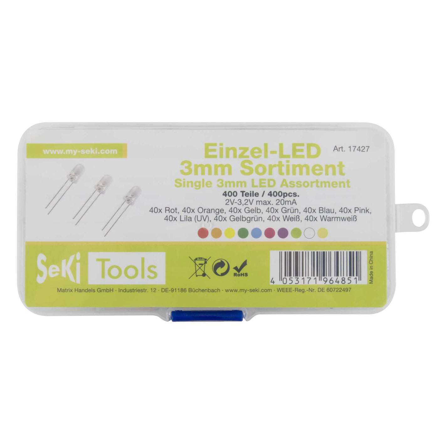 SeKi LED range with 400 pieces of 3mm light-emitting diodes - 10 values; Red, orange, yellow, green, blue, pink, purple (UV), yellow-green, white, warm white - SUPER BRIGHT