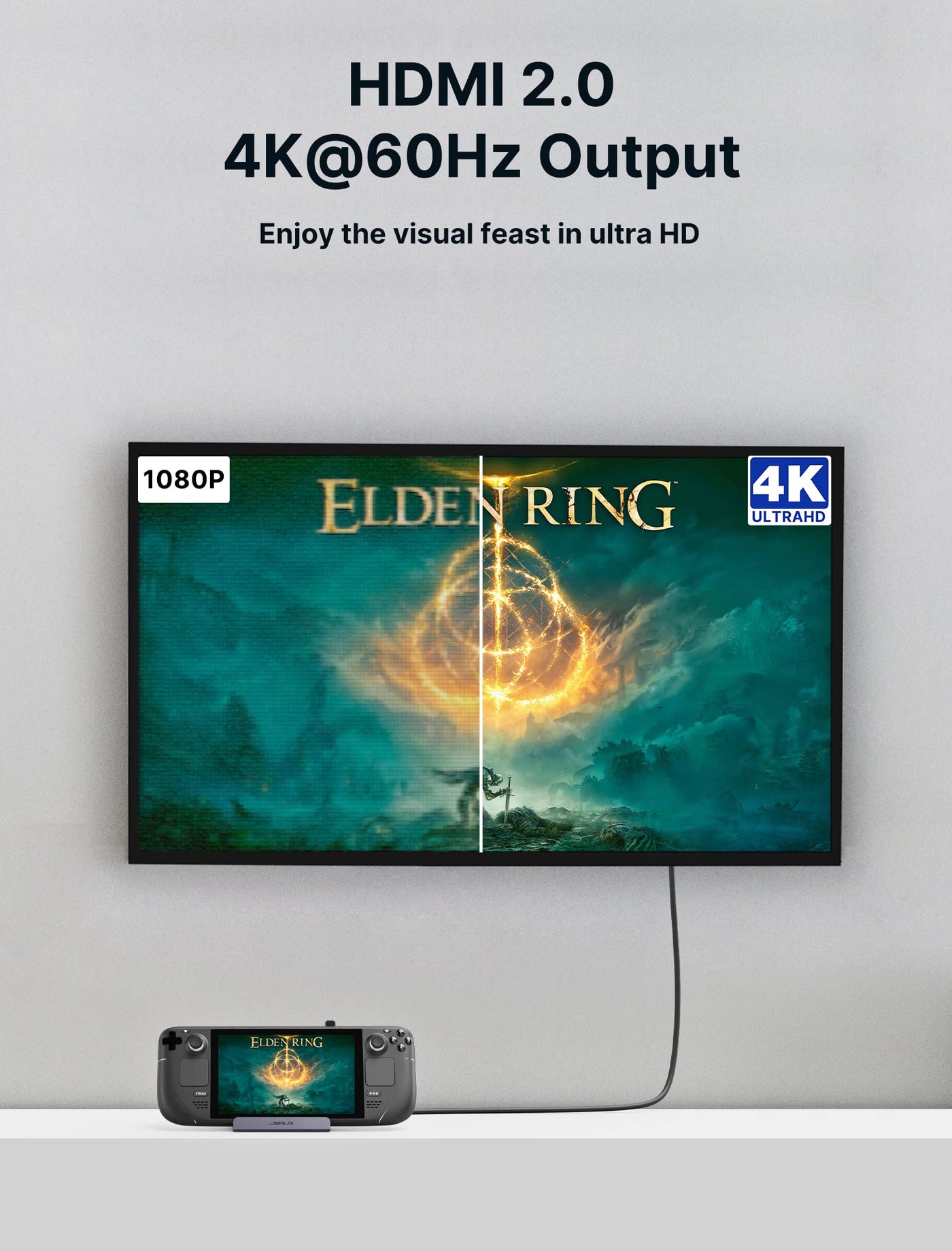 - 4K@60Hz HDMI Output: The Steam Deck Dock comes with a 4K@60Hz HDMI 2.0 output. When you connect an external 4K monitor, it can provide you sharper and smoother visual experience, so you can enjoy the visual feast on your games.
