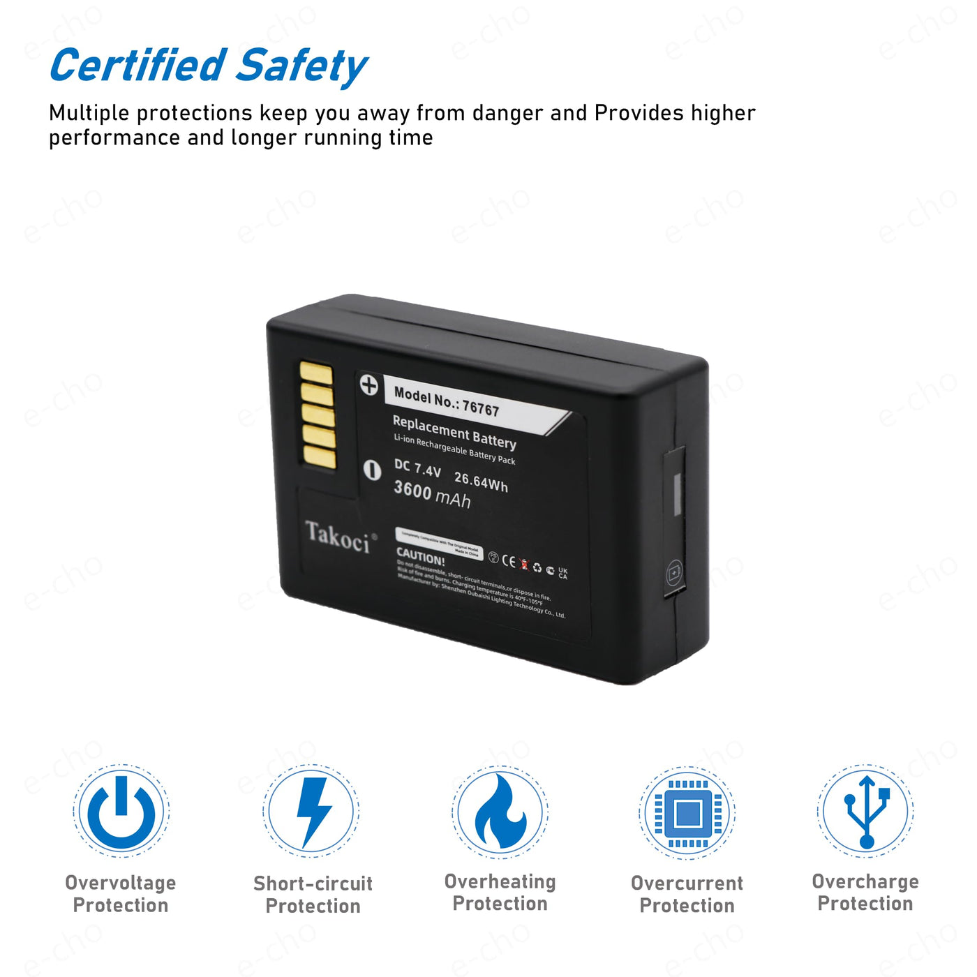 - Quality CertificationROSH, CE and UL triple certification. No memory effect, over-charge, over-discharge, over-heat, over-current and short-circuit protection.