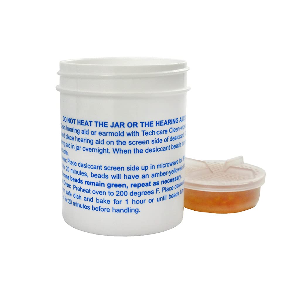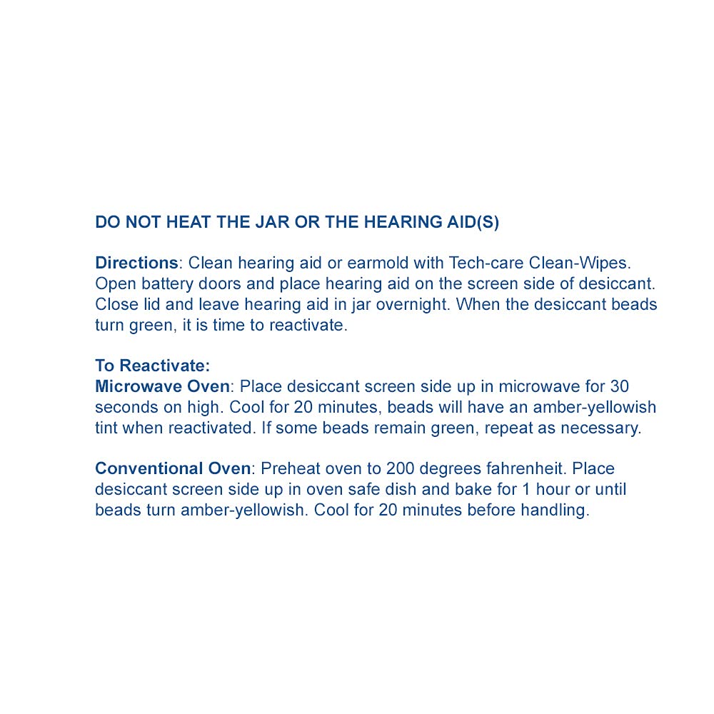 The Tech-care Hearing Aid Dehumidifier removes harmful moisture from hearing aids. Place your hearing instruments in the jar overnight to remove the moisture. Recharge the desiccant by placing ONLY the desiccant in the microwave. Instructions included.