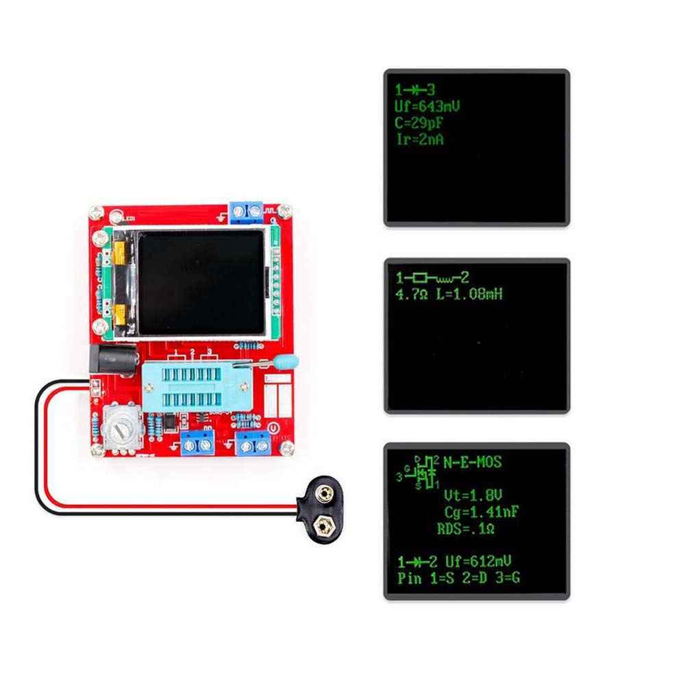 Specification 1. Test NPN and PNP transistor common emitter current amplification factor, base-emitter threshold voltage, collector-emitter leakage current at cut-off 2. Identify the Darlington transistor by the threshold voltage of the transistor base-emitter and the high current amplification factor 3. Detect the built-in protection diodes of power triode and field effect tube 4. Test the gate-source conduction threshold voltage of the field effect transistor, the on-resistance of the drain-source, and the capacitance between the gate and source 5. A maximum of 2 resistors can be measured at a time, so the three-pin adjustable resistor can also be measured. If the adjustable resistor is adjusted to the end point, only one resistance value can be measured 6. The highest resolution of resistance measurement is 0.01Ω. Can measure up to 50MΩ 7. Capacitor measurement range from 25pF-100mF, resolution 1pF 8. Simultaneously measure the equivalent series resistance (ESR) of a capacitor greater than 90nF, the resolution of the equivalent series resistance is up to 0.01Ω 9. For capacitors greater than 5000pF, the voltage drop rate after charging is also displayed. This value can reflect the quality factor (Q value) of the capacitor 10. A maximum of two diodes are measured at a time, showing their positive and negative poles, turn-on voltage 11. Light-emitting diodes are also displayed as graphic symbols of diodes, and their turn-on voltage is much higher than that of ordinary diodes 12. Zener diodes with reverse breakdown voltage lower than 4.5V can also be detected and displayed as double diode symbols. The positive and negative poles are based on the diode symbol with a turn-on voltage of about 700mV. In addition, the turn-on voltage corresponding to a diode symbol is the volta Multifunctional Transistor Tester The display unit uses a 160x128 pixel color display, the number of characters on the whole screen is 8x20, the color depth is 16 bits, and the graphics display component symbolsAdditional functions include frequency measurement, voltage measurement, square wave generator, PWM generator, infrared remote control decoding, infrared remote control coding, DS18B20 temperature sensor test, DHT11 temperature and humidity sensor test, color selection, debugging calibration, continuous testing, etc. Read more Package included: 1 x GM328 Transistor Tester Kit Note: 9V Stacked Battery Not Inciuded ! Read more