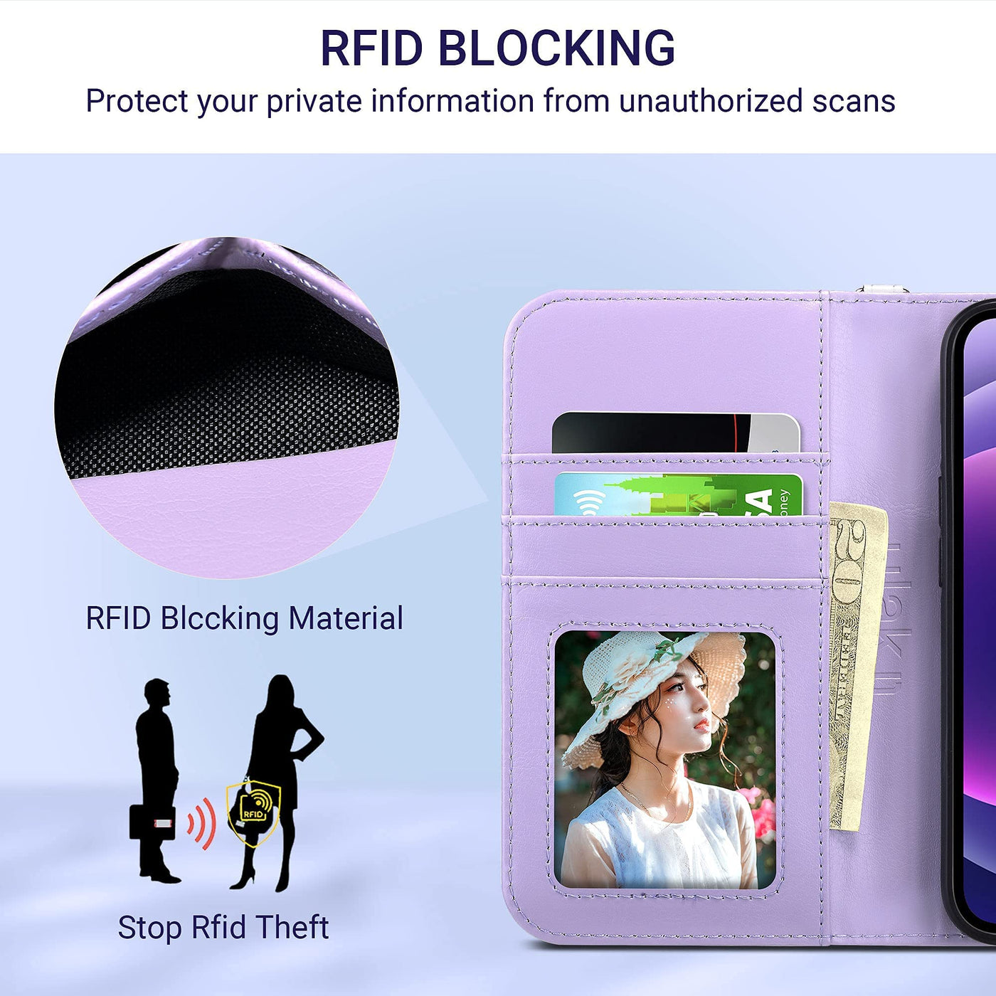 - Large Capacity Card Slots: Wallet Case with 3 card holder slots and 1 side pocket, conveniently store your ID, license, photo, cash and credit cards. No need to take an extra wallet when going out. RFID technology application on the inner fabric effectively shields the signals and keeps your personal information safe